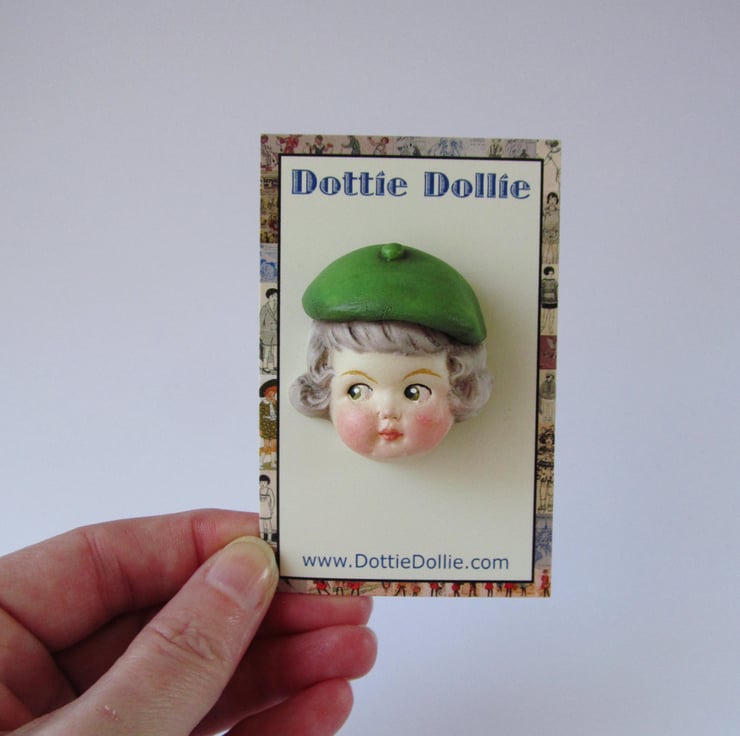 Dottie Dollie Pin Brooch - Rose with a Green Beret is a handmade replica of a real broken antique doll head from my collection, the original head was broken, dirty and unloved, having been discarded and buried as rubbish almost a hundred years ago.