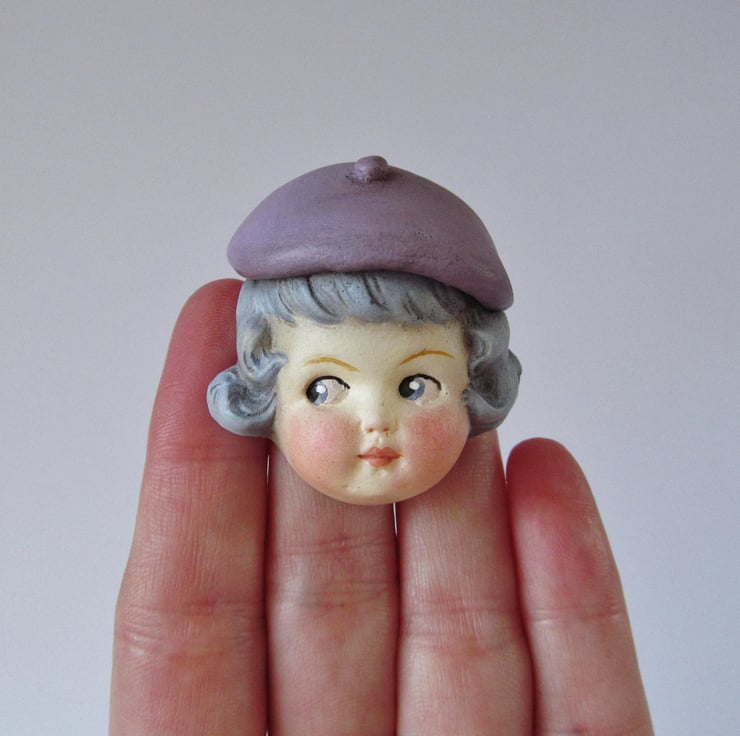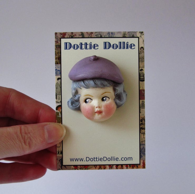 Dottie Dollie Pin Brooch - Rose with a Lilac Beret is a handmade replica of a real broken antique doll head from my collection, the original head was broken, dirty and unloved, having been discarded and buried as rubbish about a hundred years ago.