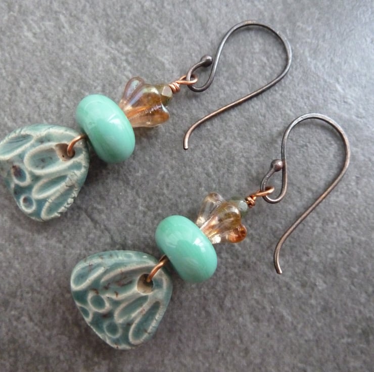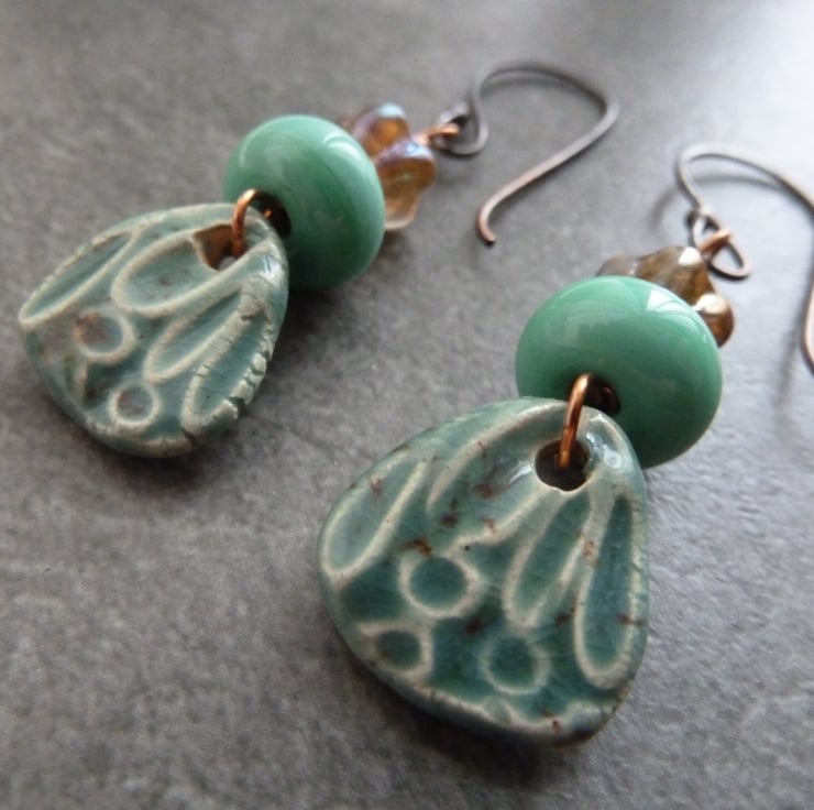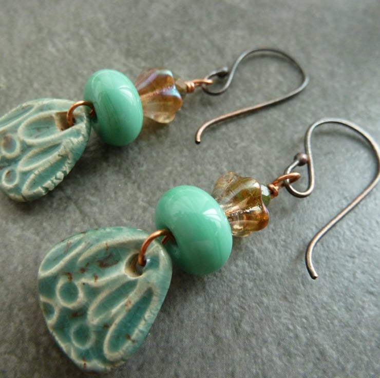 A pair of earrings made using handmade copper ear wires, glass beads, handmade lampwork green glass beads and handmade green ceramic drops.