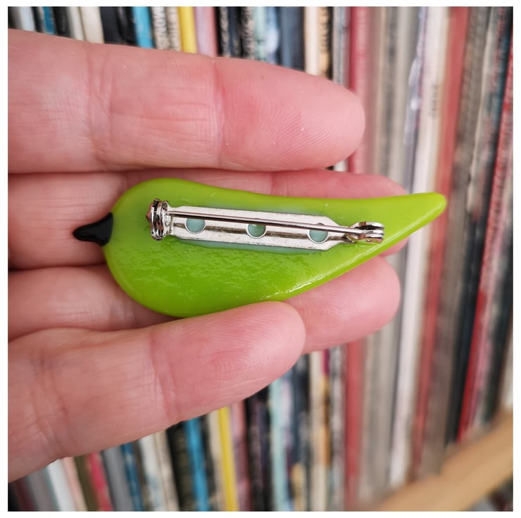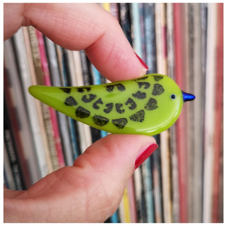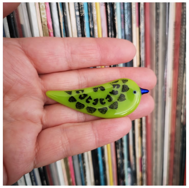 A cute lime green glass bird brooch with a little shiny dark blue dichroic beak. It measures 5cm x 2cm cm.