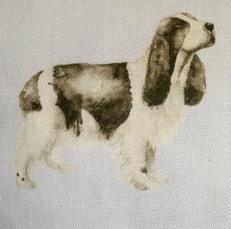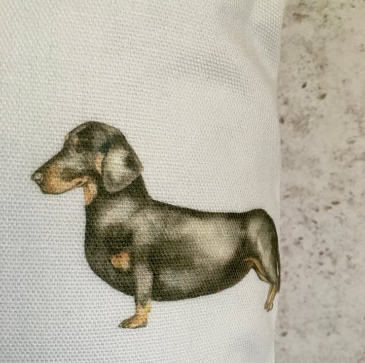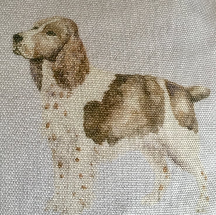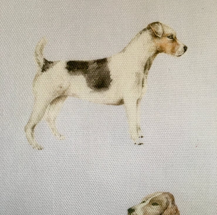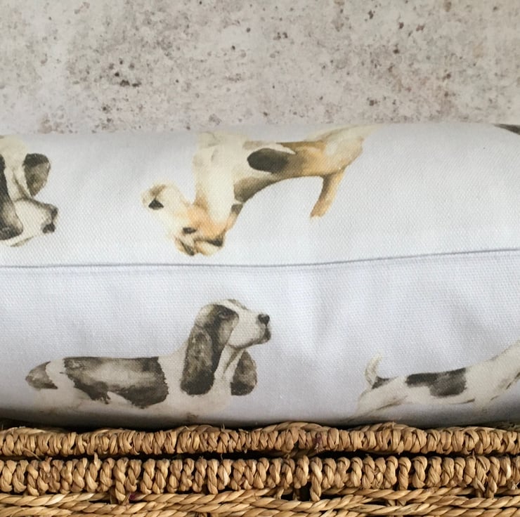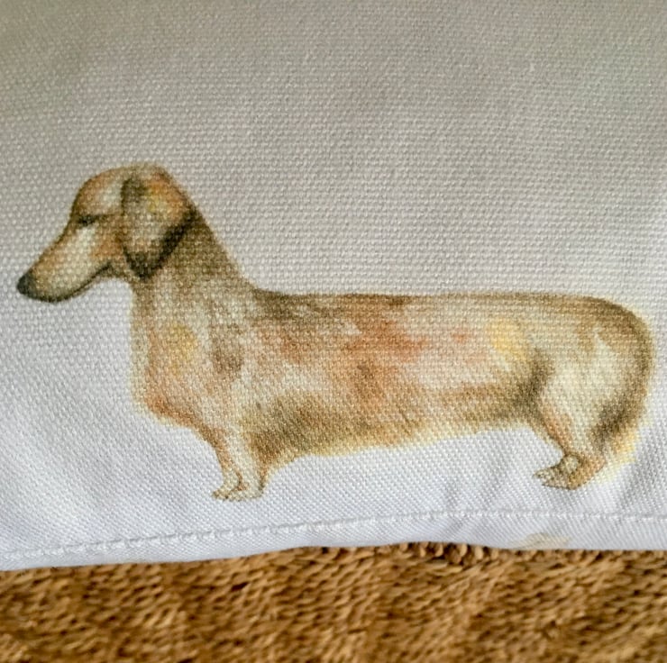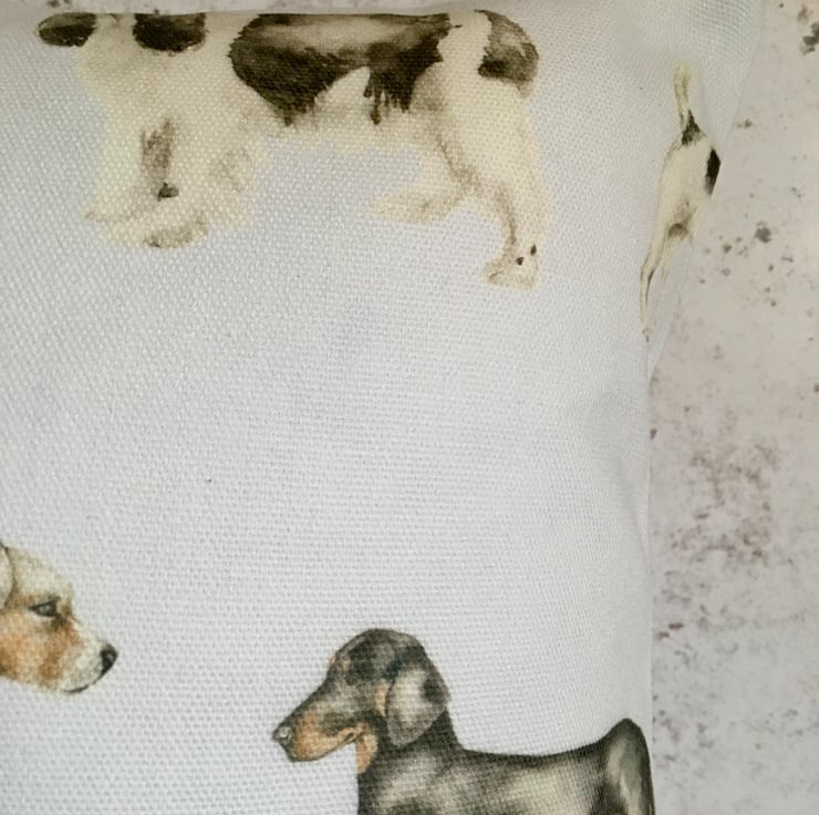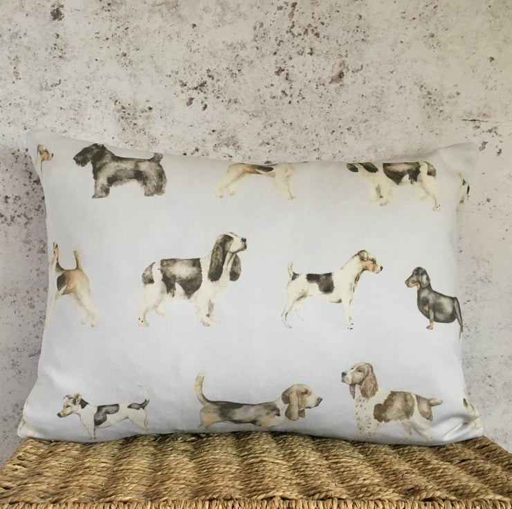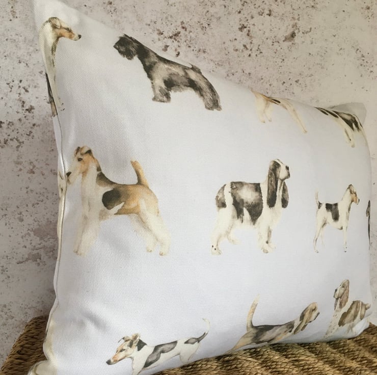 Dog lovers lumbar cushion cover, in Voyage Woof, cotton & linen mix. This lumbar cushion cover, features watercolour images of different breeds of dogs, on a white or slightly off white background. It has been designed to fit a 43cm x 33cm cushion inner which is not included.