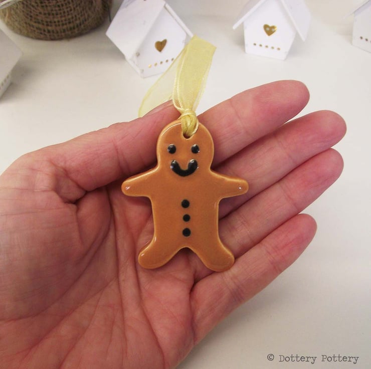 They are made from white earthenware clay, finished in a buttery brown glaze and thread with a matching organza ribbon.