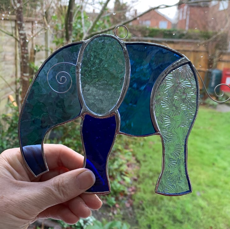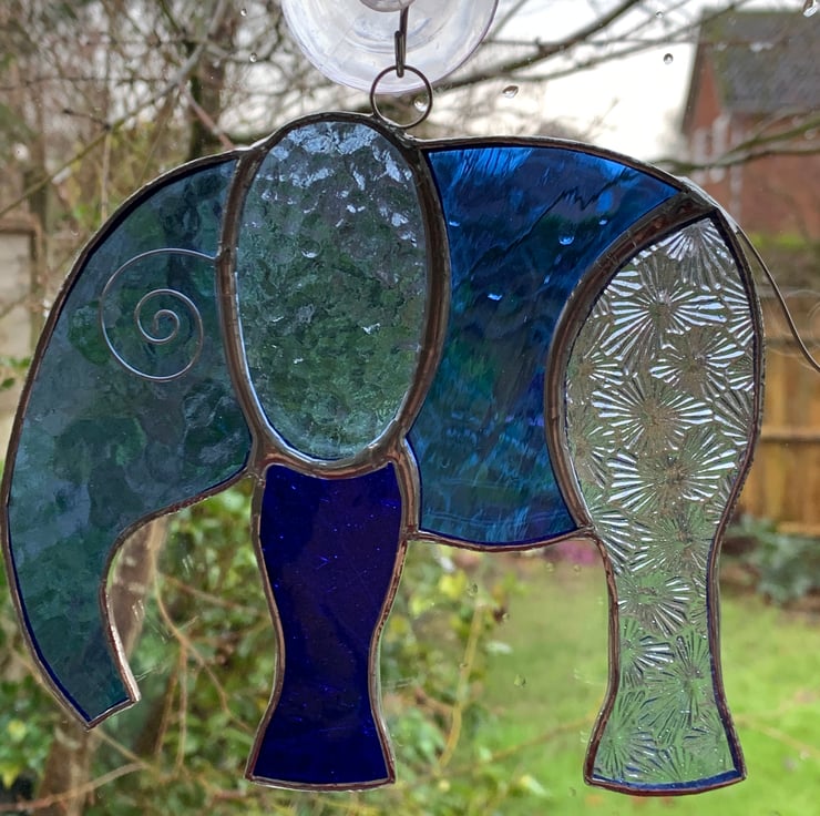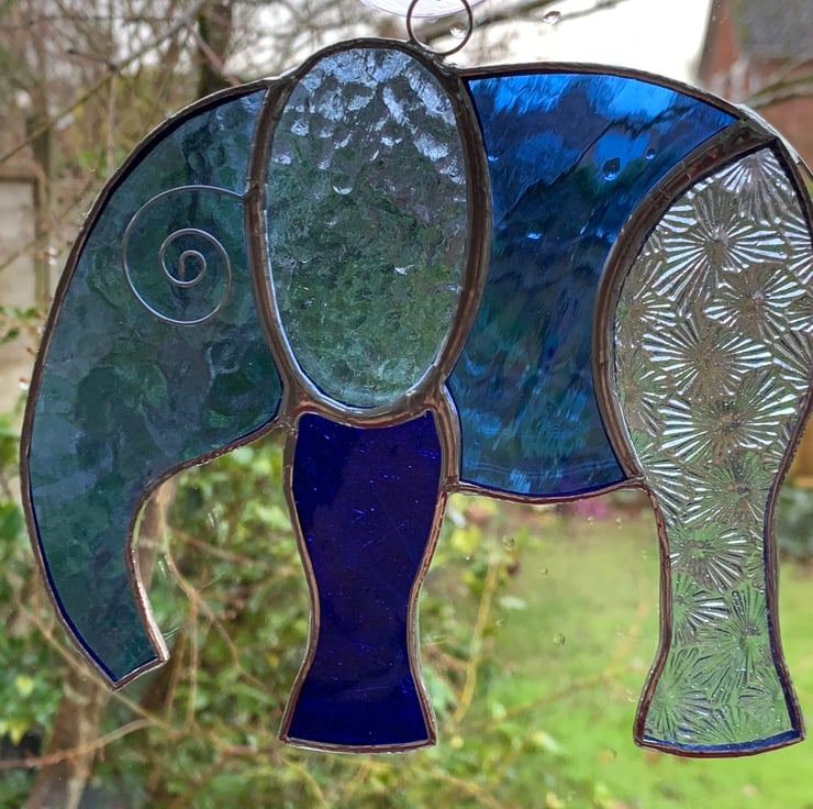 This elephants measure 14.5 cms x 13 cms and has been made from a selection of 5 different types of blue stained glass which will definitely brighten your window.