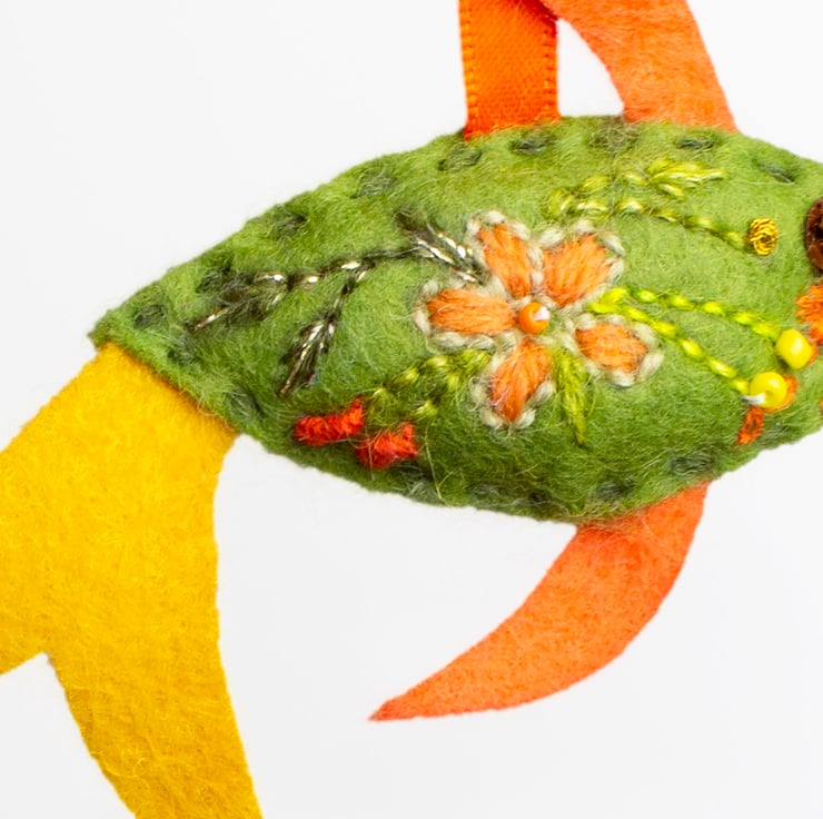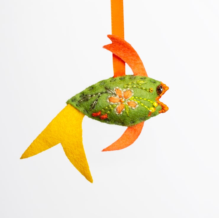 Please welcome Gilbert - a fish shaped bag charm/keyring. Gilbert has been made out of colourful felt fabric and his body is hand embroidered with a floral design. He has a ribbon attached with a gold lobster claw attachment - he can be used as a keyring or bag charm.