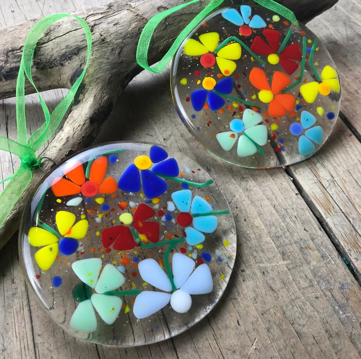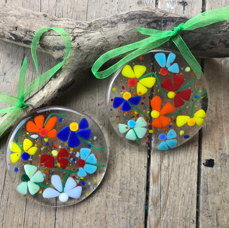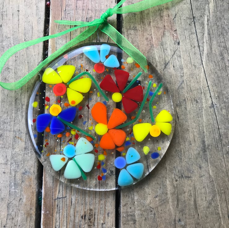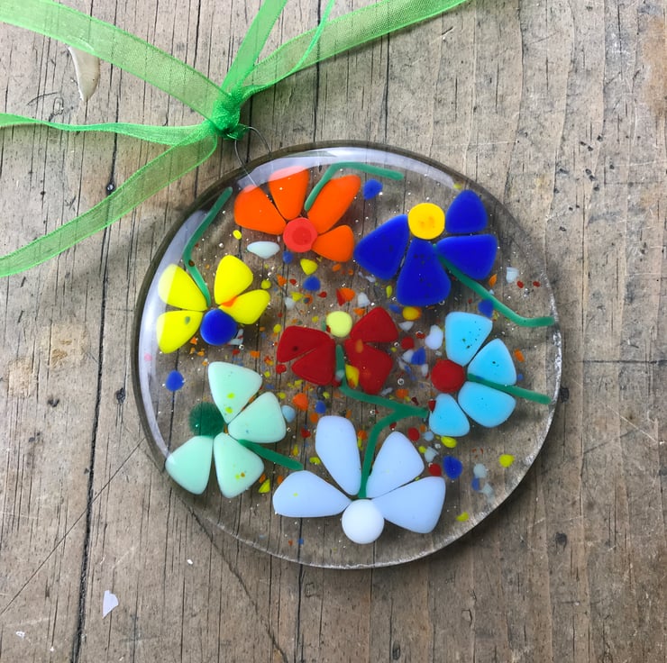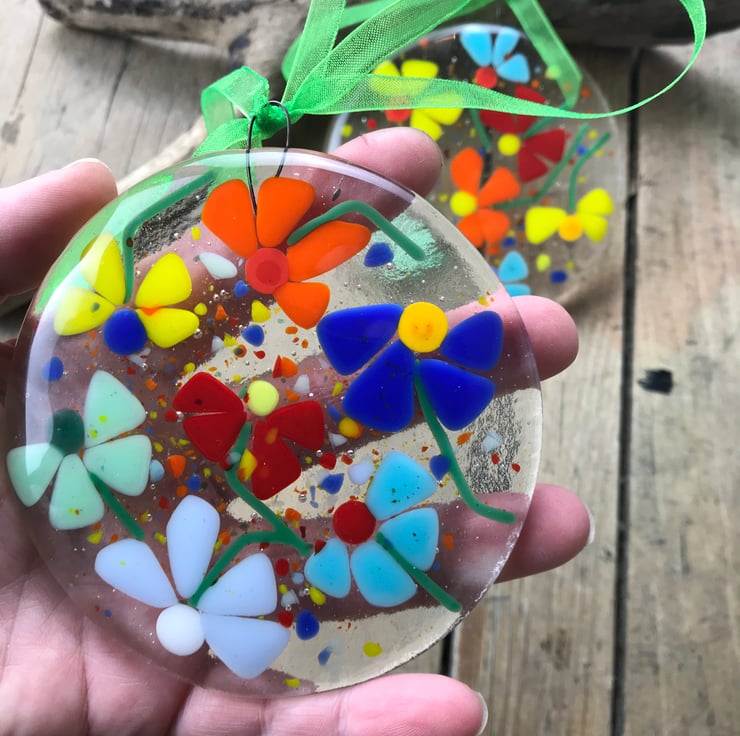 It is approximately 9 cm in width and height. It is made from two hand cut glass circles and a third layer of coloured glass for the flowers and it’s all fully fused in a kiln.