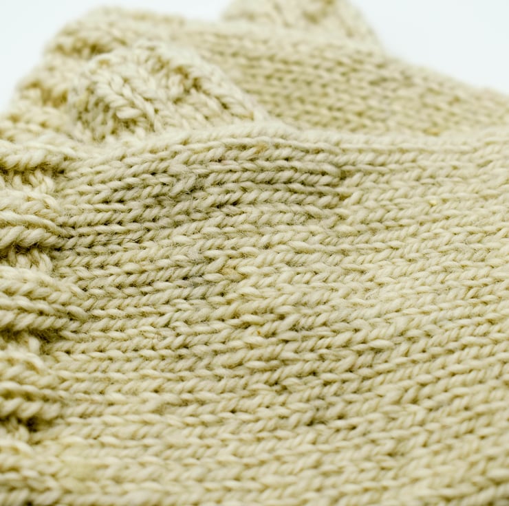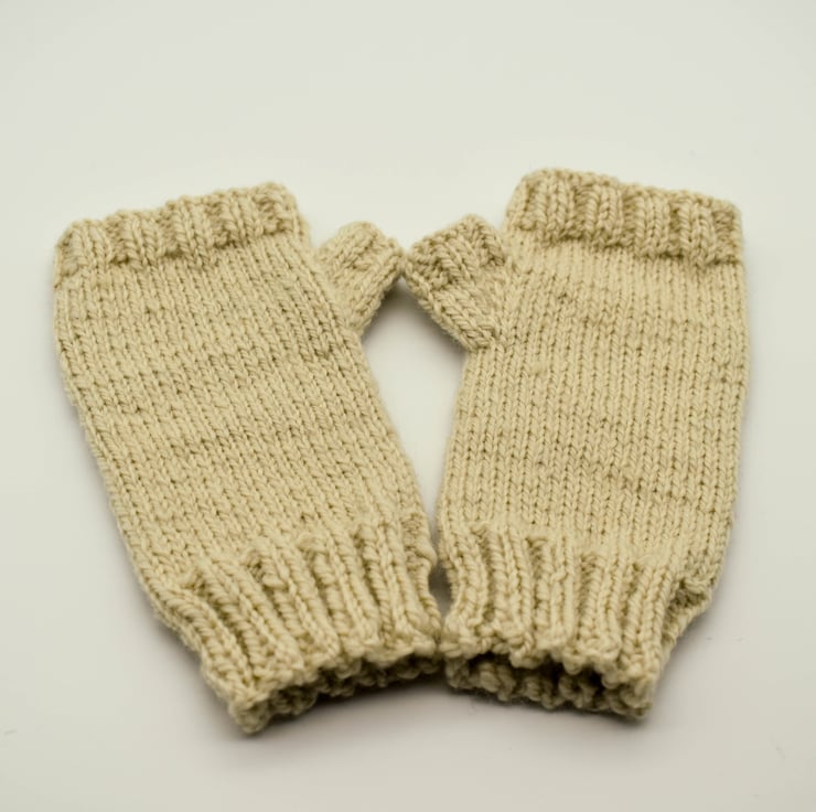 These hand knitted fingerless mittens are made from cream 100% Border Leicester wool. Great for keeping your hands and wrists warm while keeping you fingers free. This wool is from a single breed flock in Yorkshire.