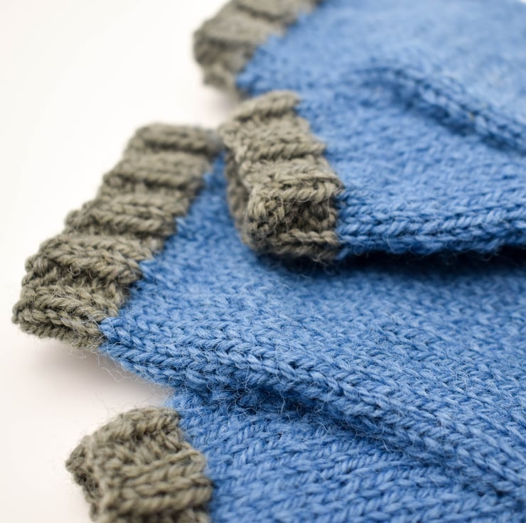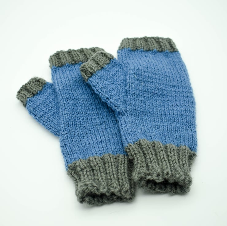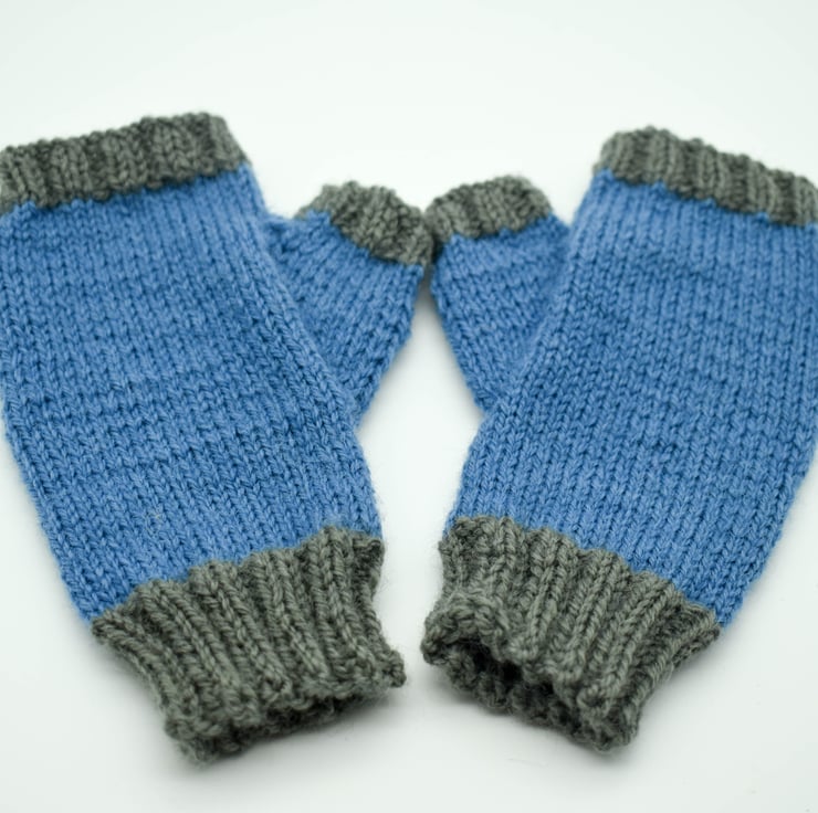These hand knitted fingerless mittens are made from blue and grey 100% Border Leicester wool. Hard wearing and incredibly warm, ideal for robust and adventurous little kids.
