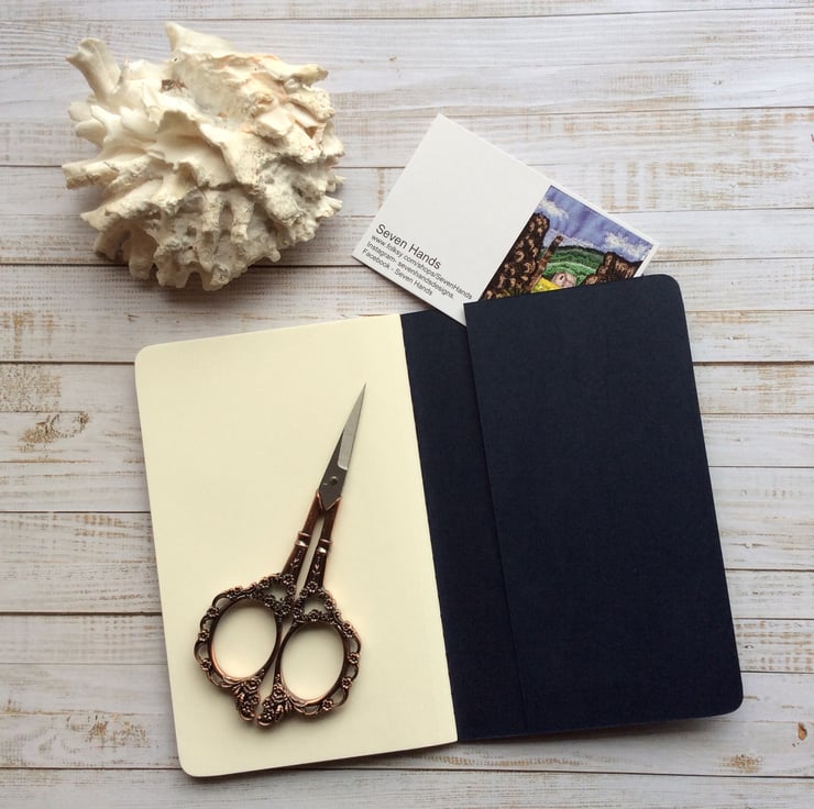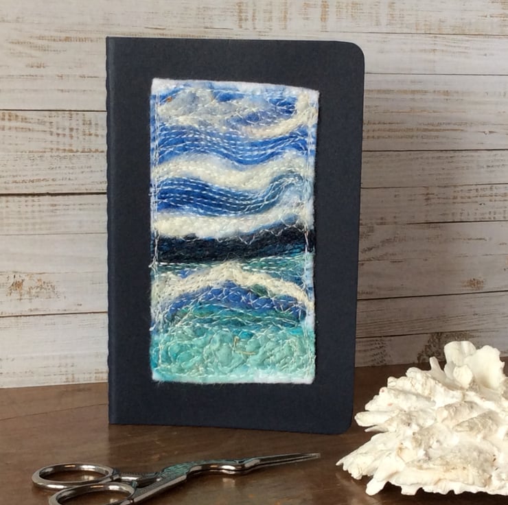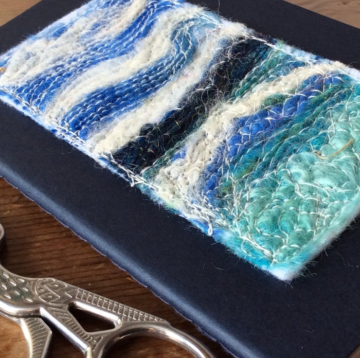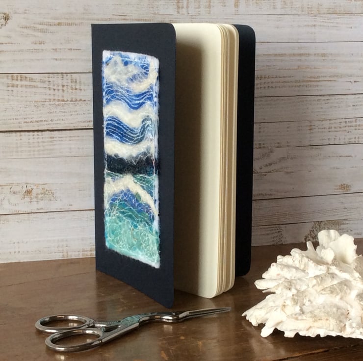 Seascape notepad or journal comes with plain paper pages and an embroidered blue/black card cover. It’s enhanced with an original felting wool free motion embroidery of the sea. It’s ideal for making notes, lists or doodling, and will neatly fit a handbag or pocket. The stitched Moleskine Cahier is made from paper and blue/black card, measures 14 x 9cm, contains 64 pages, inside the back cover is a little pocket for important notes or cards.. The artwork measures 6 x 11 cm.