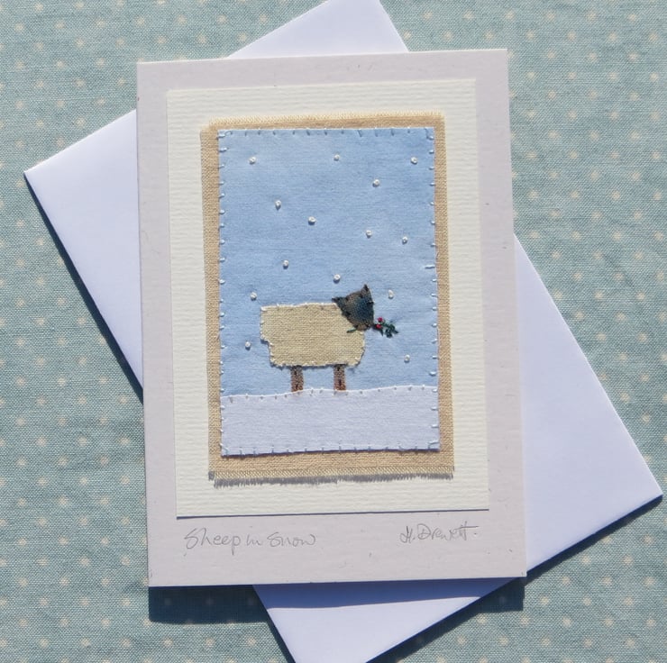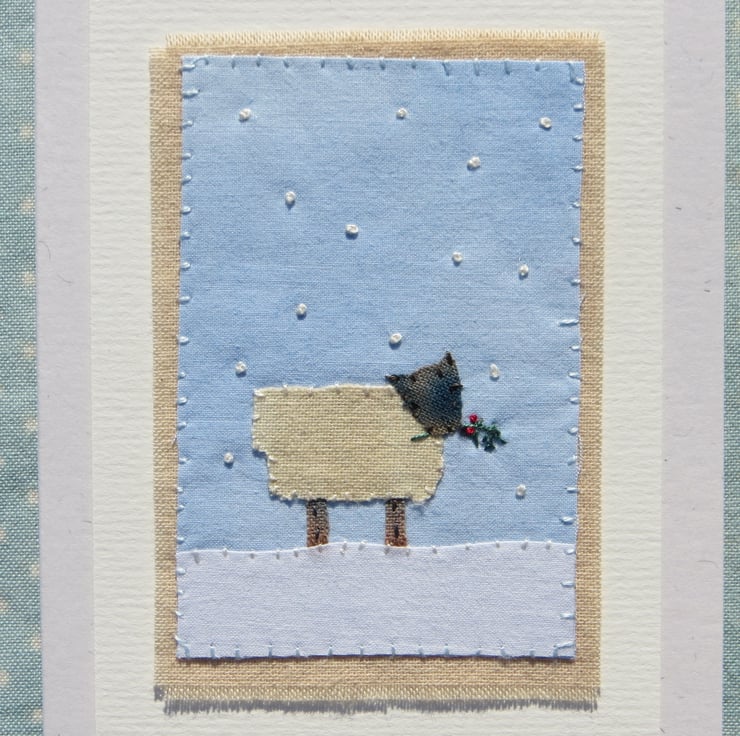 This is a small handmade greeting card featuring a miniature hand-stitched applique made using recycled hand-dyed cotton with intricate embroidered details. It is entitled 'Sheep in Snow and' would be perfect for Christmas, definitely a card to keep!