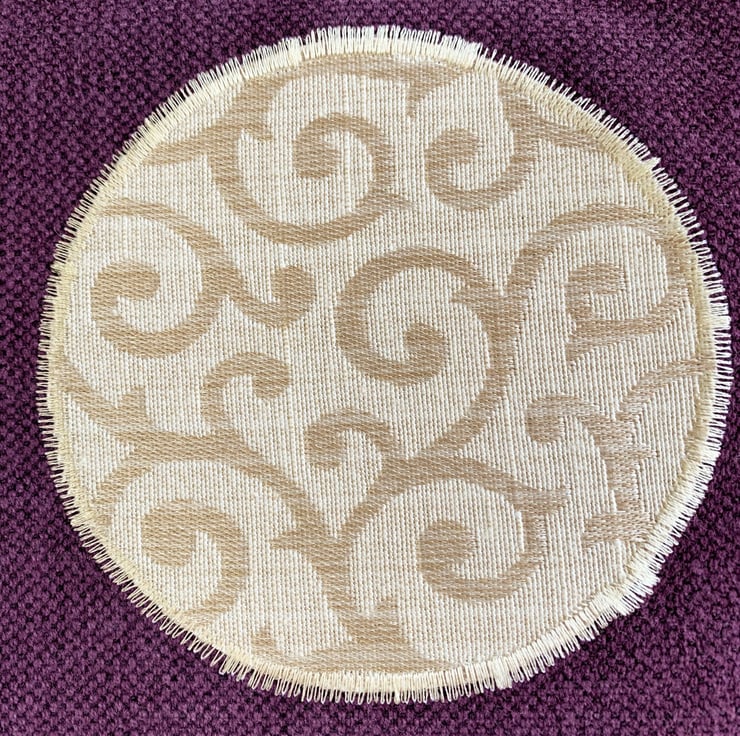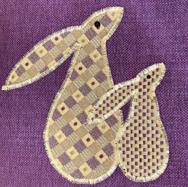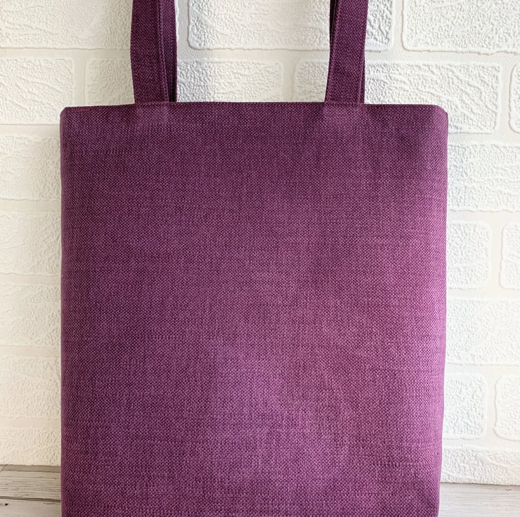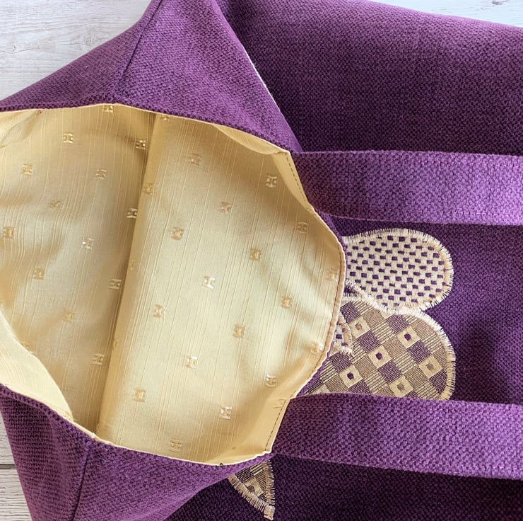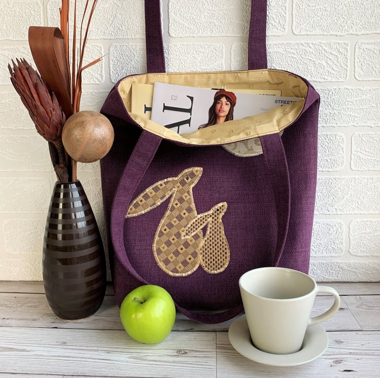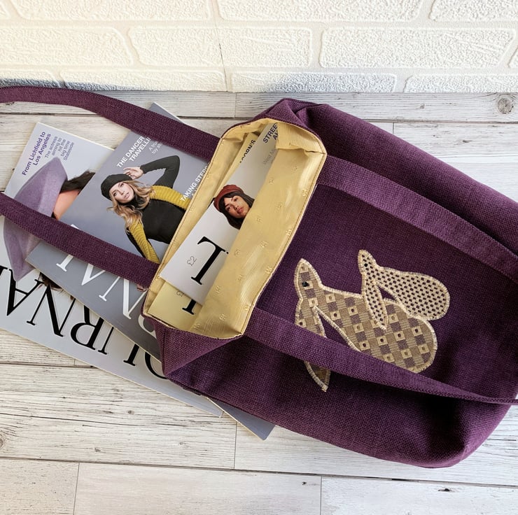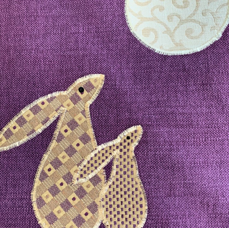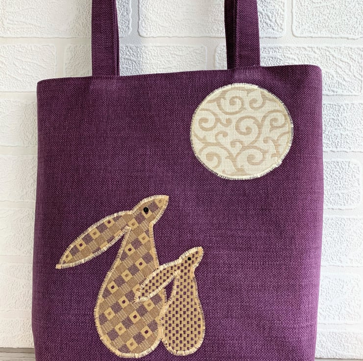 A sturdy tote bag in a lovely rich plum purple colour with an appliqué scene depicting two hares gazing at the moon. The two moon gazing hares are made from lovely co-ordinating gold and purple fabrics. The larger hare has a woven pattern of gold and purple checks with purple dots and the smaller hare has a pattern of tiny checks in the same colours. I've added black sequins for eyes. The large full moon is made from a pale gold fabric with a beautiful swirled woven pattern with a slight sheen. The bag is fully lined with gold coloured fabric with a woven pattern of small shiny squares.