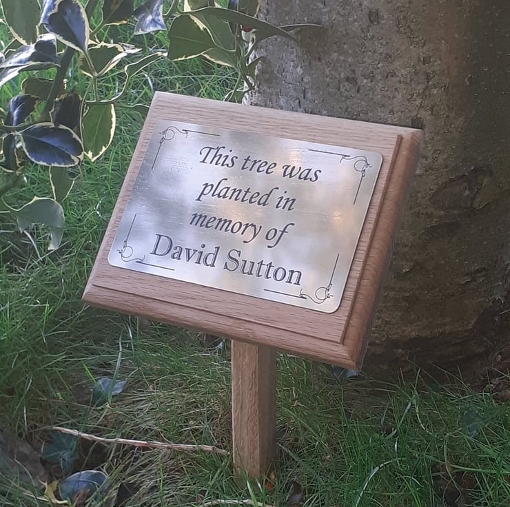 Overall measurements of the wooden plaque are approx 185mm X140mm X 25mm thick. And is attached to an upright (45 degree angled) stake to allow easy mounting in the ground. Stake measures Approx 200mm long.