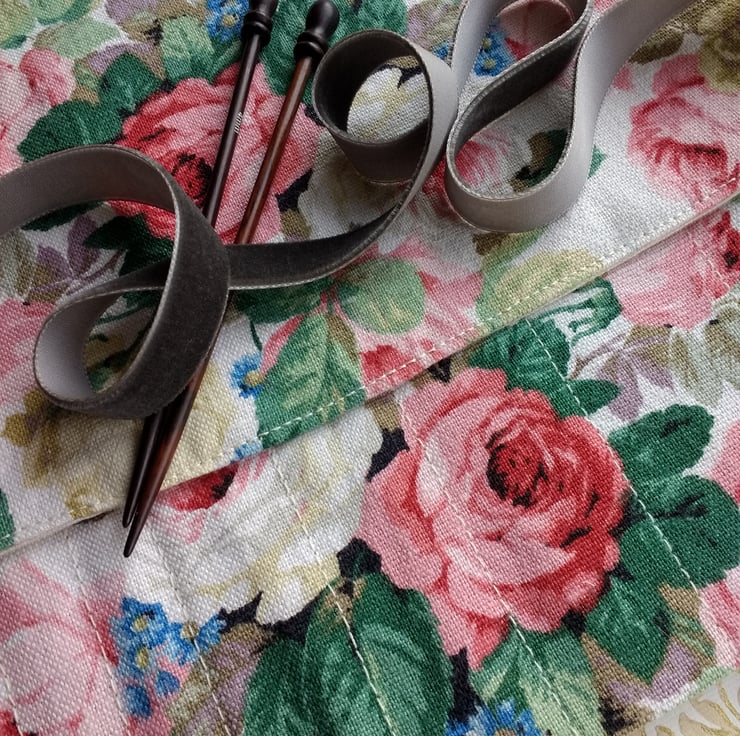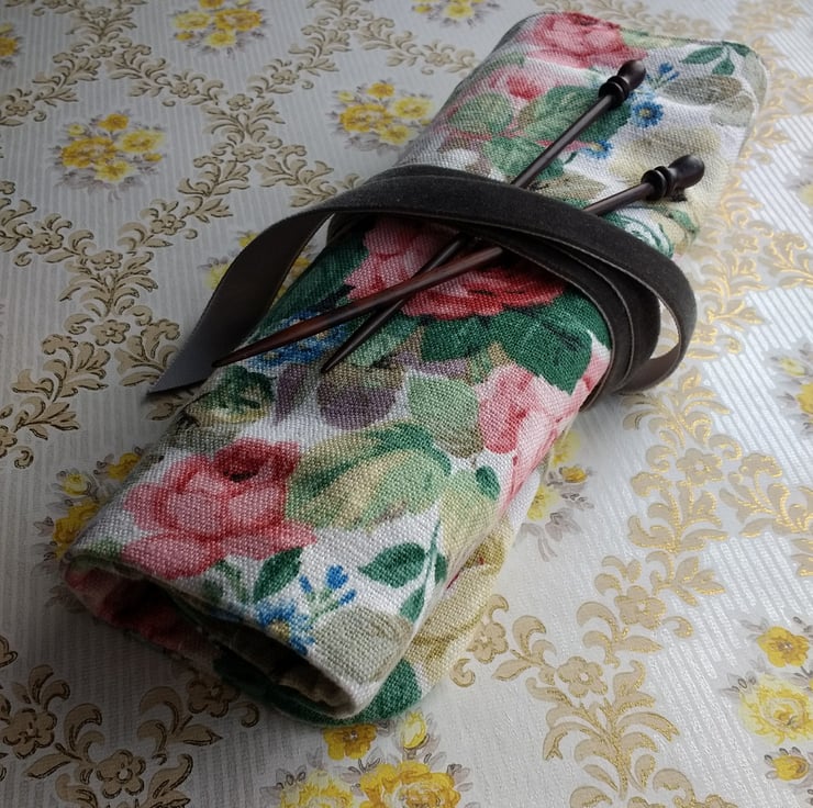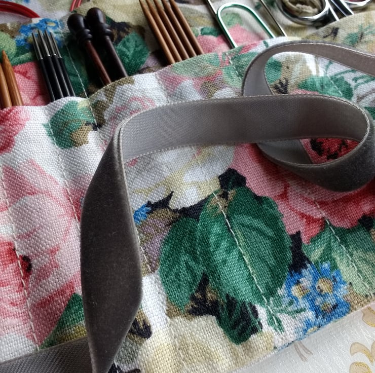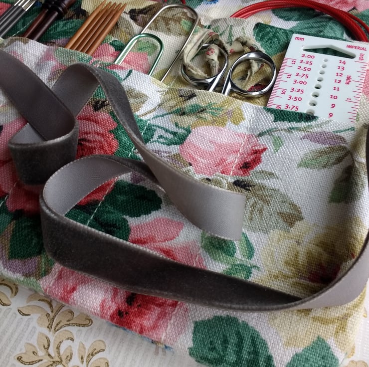 Made from time softened and re-purposed vintage furnishing fabric, the Judit knitting needle wrap is the perfect place to store a small selection of fixed circular knitting needles along with an assortment of accessories.