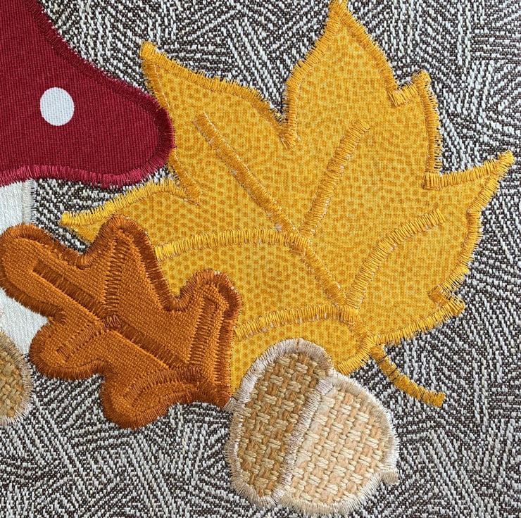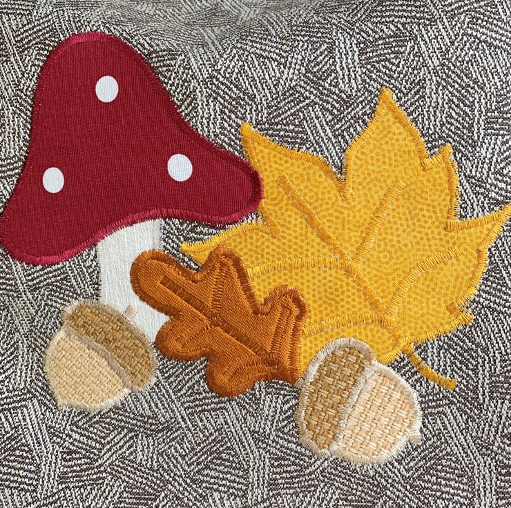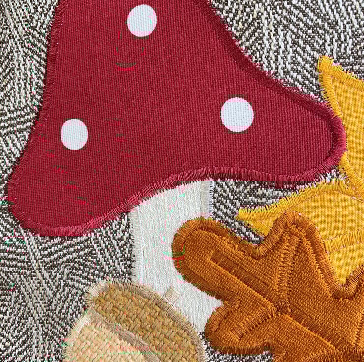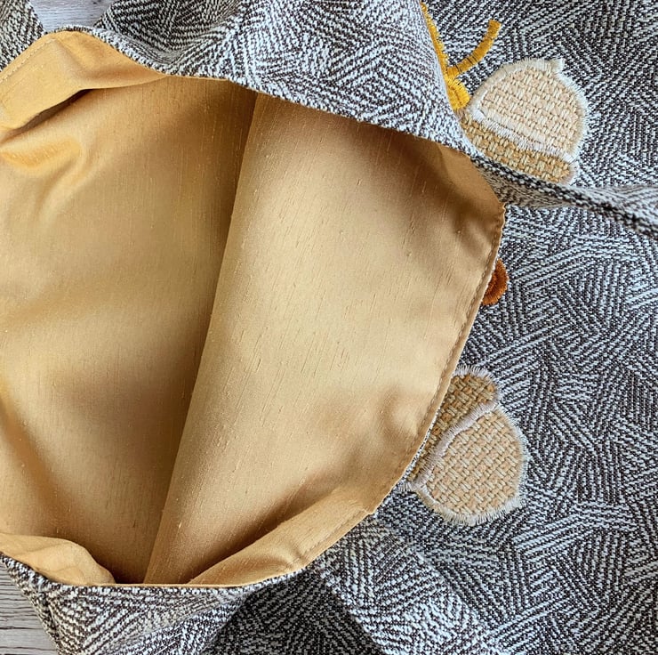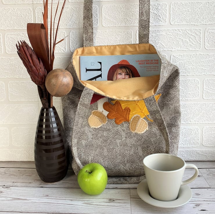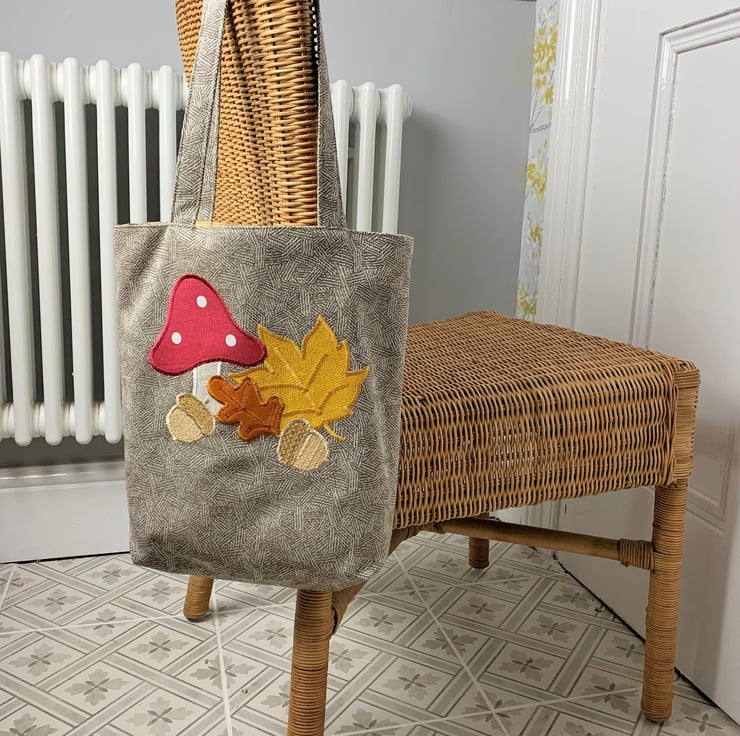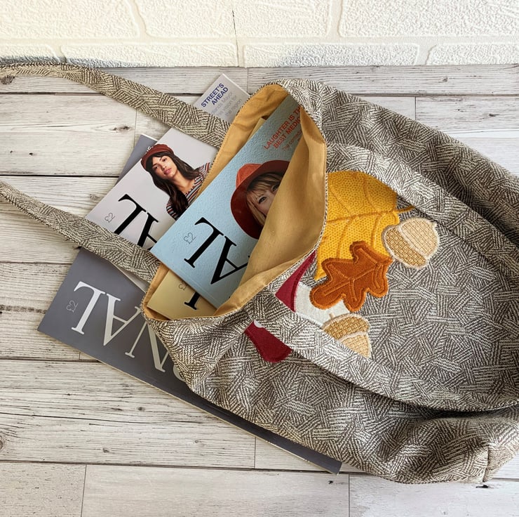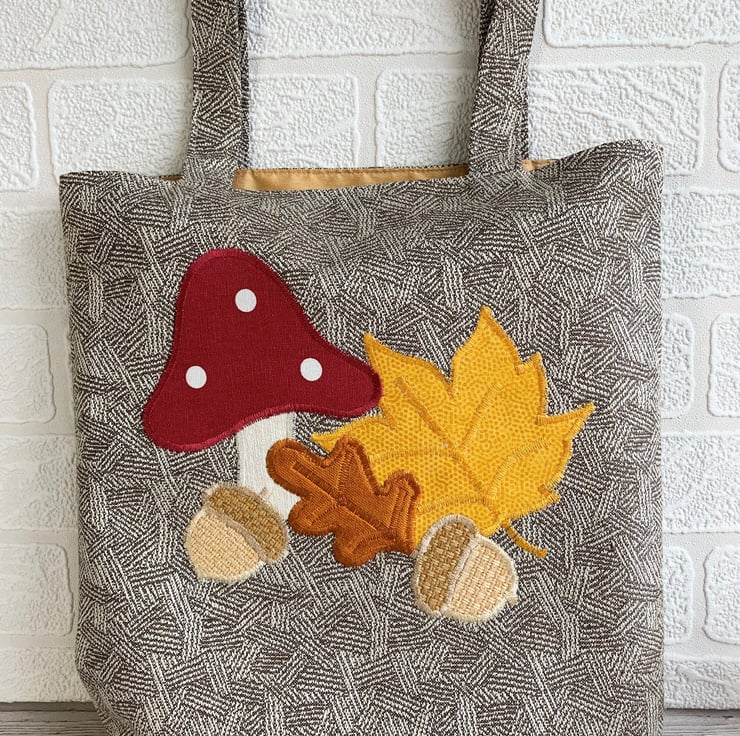 A delightful tote bag in patterned fabric with an appliqué Autumn woodland scene. The main fabric has a subtle woven geometric pattern in beige and cream. The appliqué scene features a toadstool, two acorns and an oak leaf and maple leaf. The top of the toadstool is made from a maroon red fabric with white polka dots. The stem is cream. The acorns are made from two shades of rustic beige fabric. The oak leaf is burnt orange velvet and the maple leaf is golden yellow with a subtle print pattern of tiny dots. I've added machined satin stitch detailing to the leaves to depict the leaf veins. The bag is fully lined with golden yellow fabric with a slight sheen.