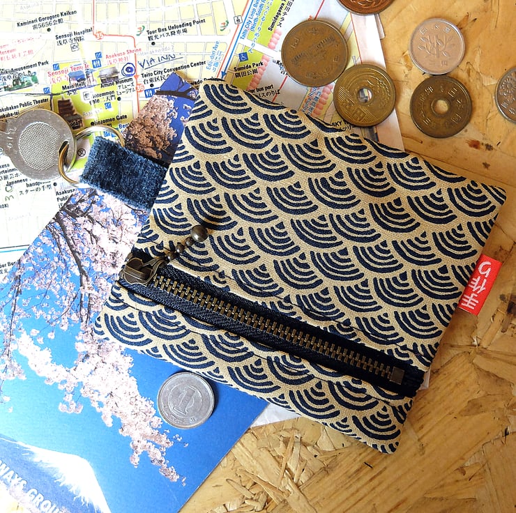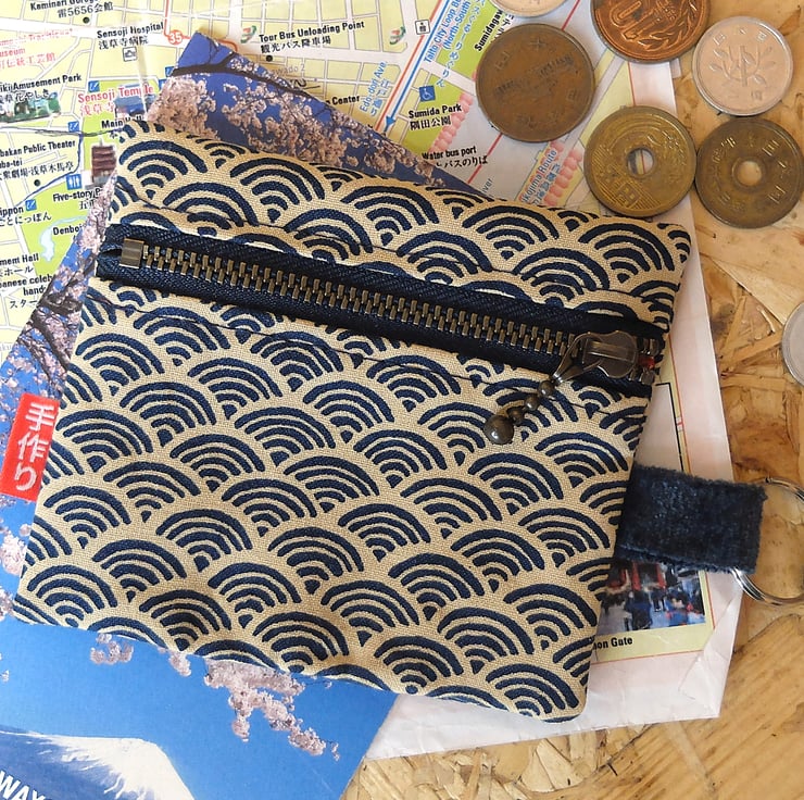 Practical zipped flat key/coin purse with tab, made with Japanese wave pattern cotton fabric.