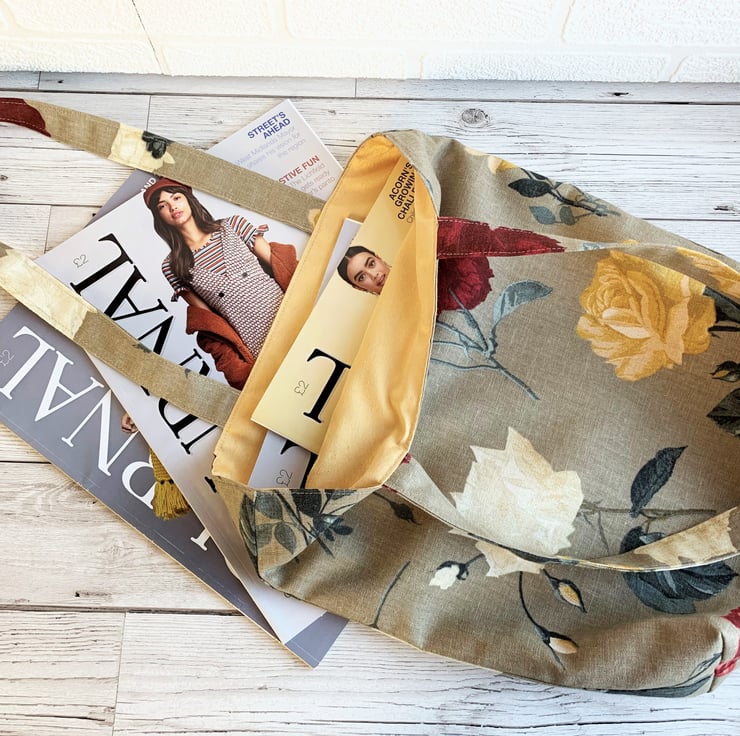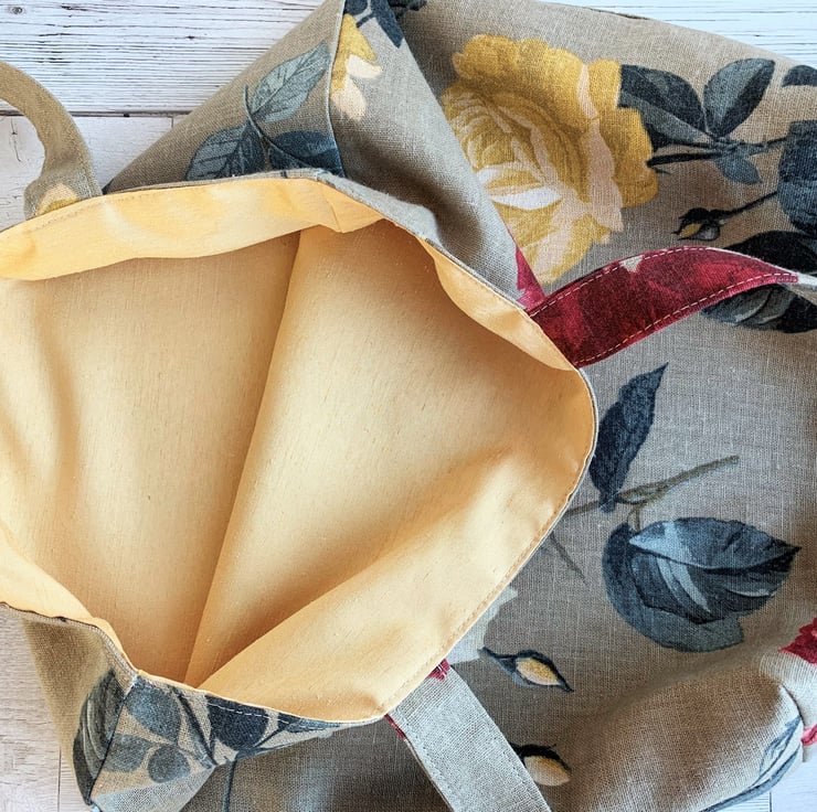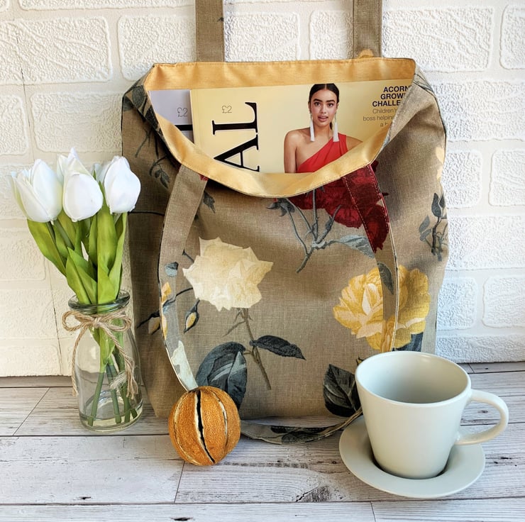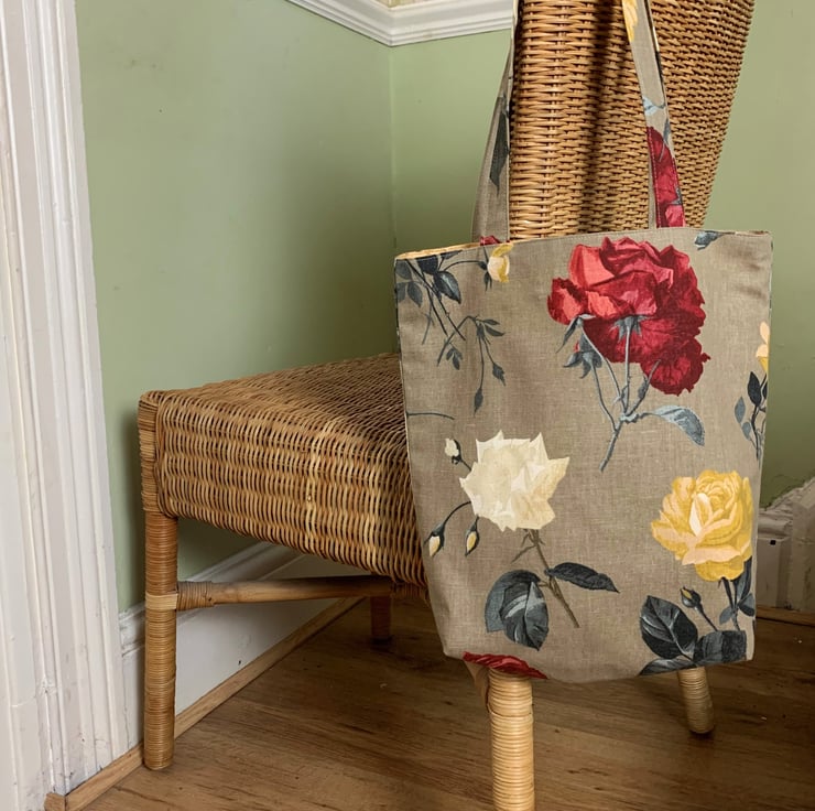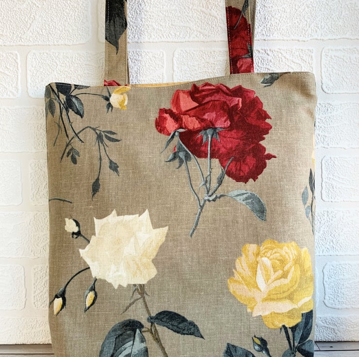 A lovely and handy tote bag in a bold and bright floral print fabric. The pattern features large stems of red, yellow and white roses and rosebuds with dark green stems and leaves on a beige background. The bag is lined with a co-ordinating golden yellow fabric with a slight sheen.
