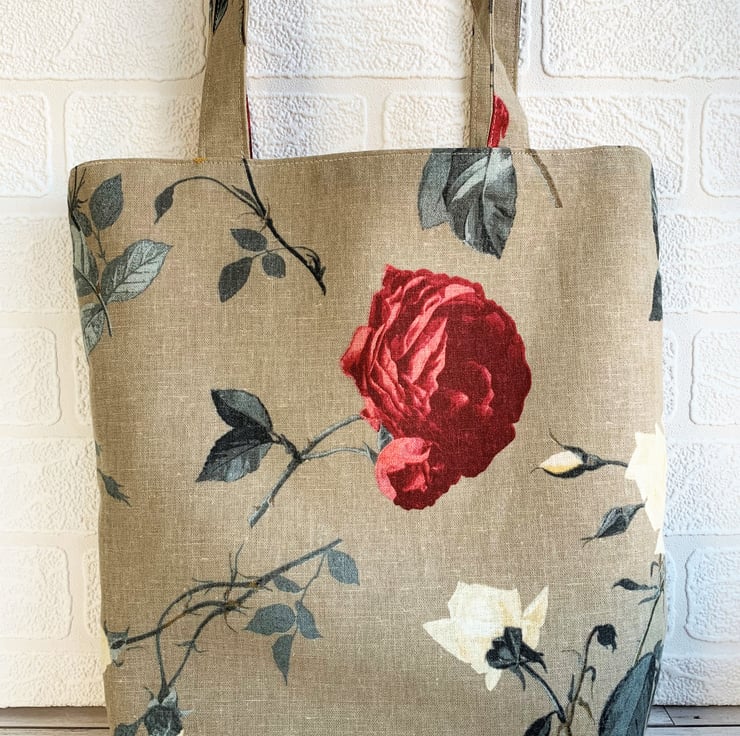 This tote bag is very versatile - perfect for use as a shopping bag but pretty enough to be used as a handbag. It is a lightweight bag and can be easily folded and placed inside a handbag. With its bold and beautiful floral pattern, it would make a lovely gift, particularly for anyone who loves gardening and roses.
