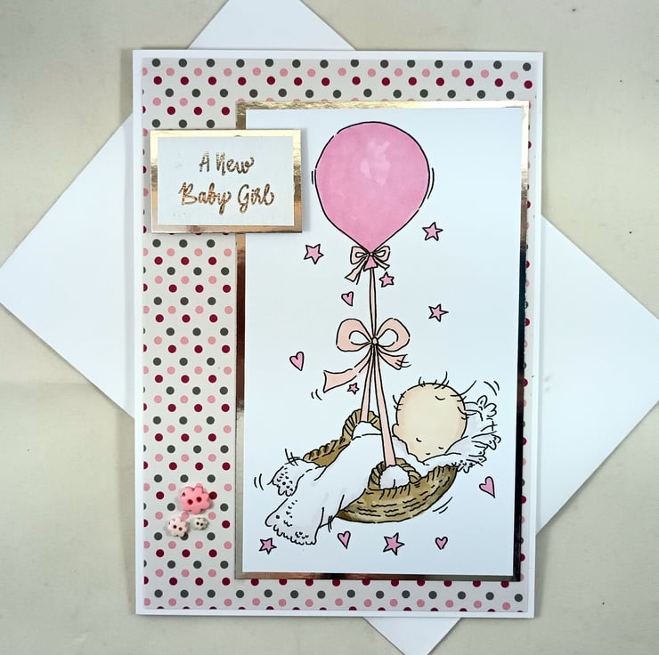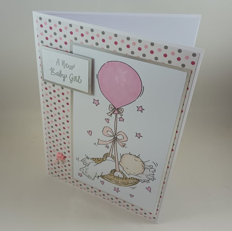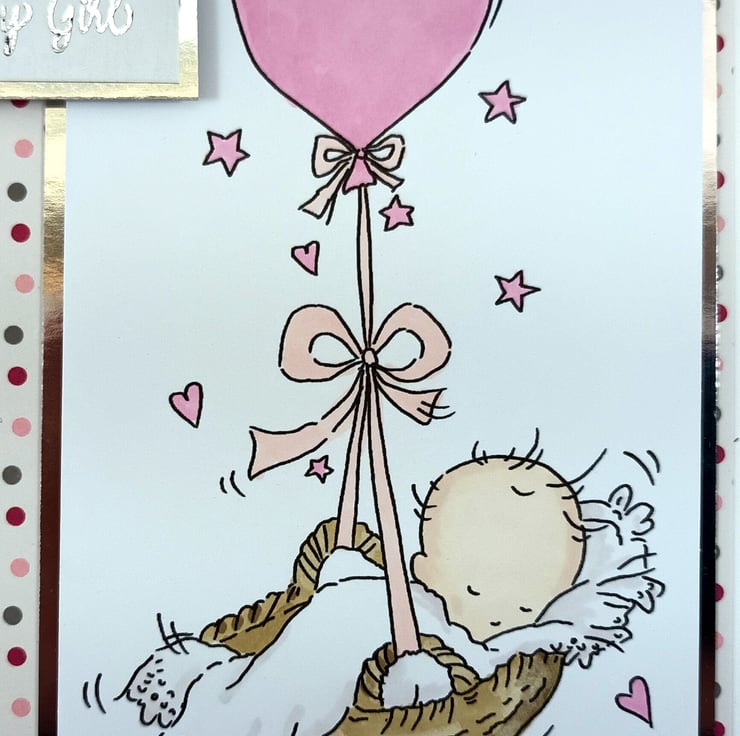 New baby girl card featuring a hand coloured image of a baby sleeping in a basket, tied to a balloon. The image and sentiment 'A New Baby Girl' have both been framed in silver mirri card and overlaid onto a background of pink, maroon and grey polka dots. The card has been embellished with small pink buttons.