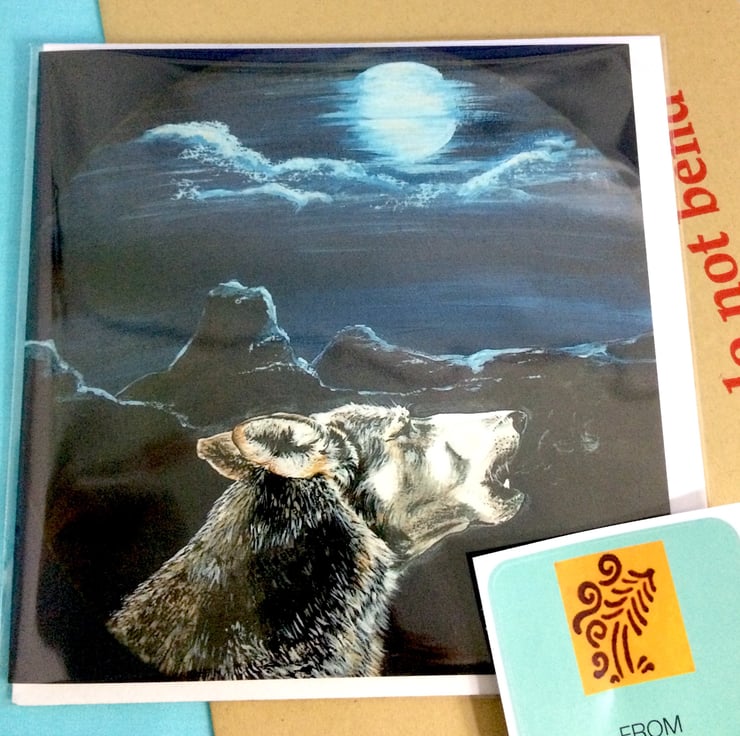 Quality printed blank square card from my own original painting 'Howls at the Moon' depicting a moon gazing wolf. (includes envelope). Posted to you in a cardboard backed envelope or can be hand written and sent direct to a recipient by first class mail for no extra charge. Price includes UK 2nd class postage.