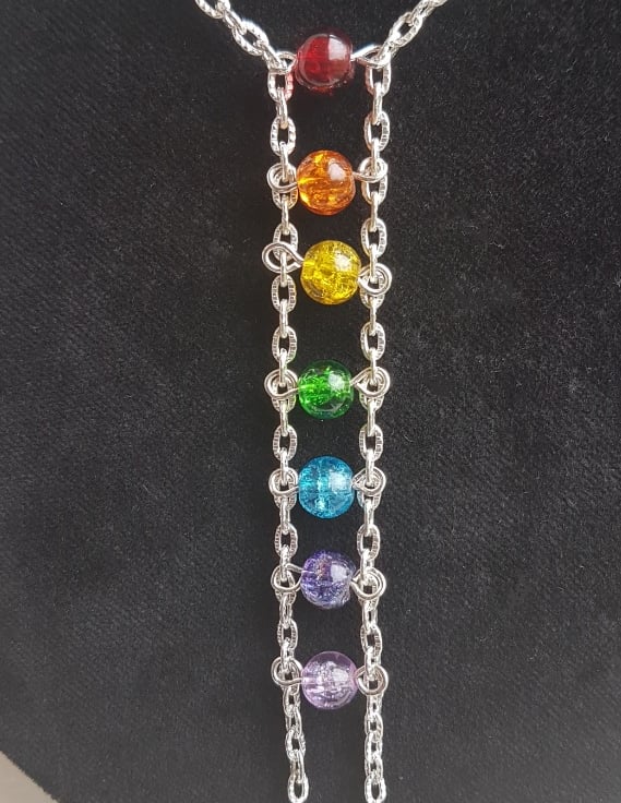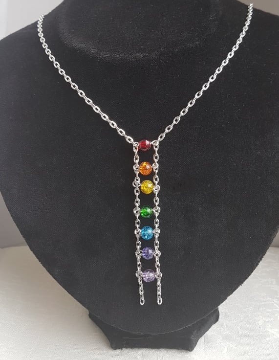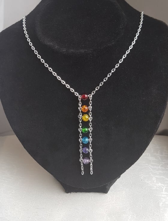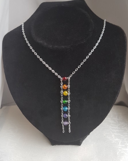 Fabulous Silver plated chain with colourful crackle glass beads make this a stunning piece. The crackle glass beads make a beautiful rainbow dangle to front of this unusual necklace. Gorgeous as a gift.