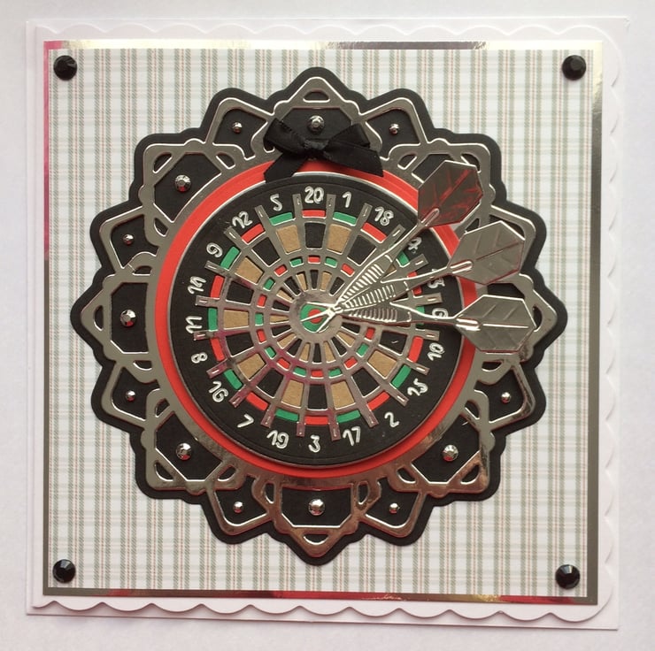 The design is a 3D dartboard with three silver darts. Everything on the card is painstakingly hand-cut by me and decorated further with silver gemstones.