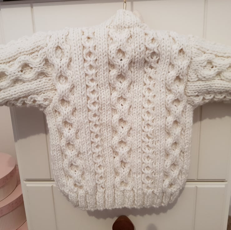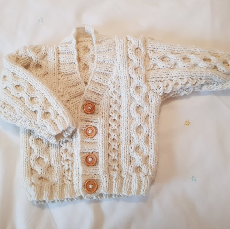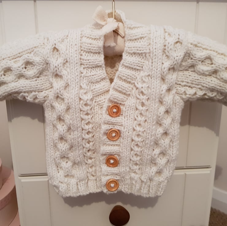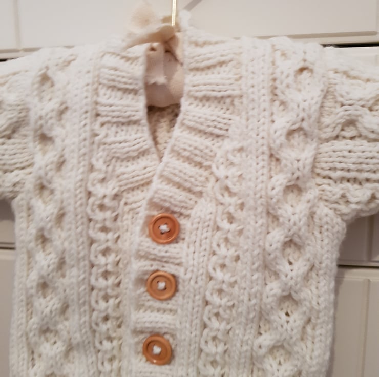 A beautiful Hand Knitted Cream Cardigan with a traditional Aran pattern.