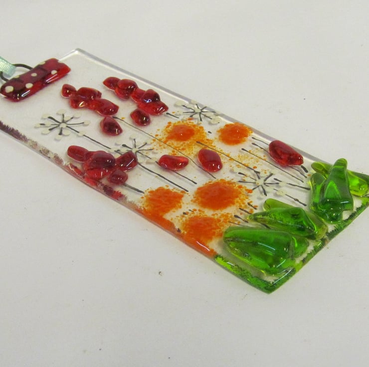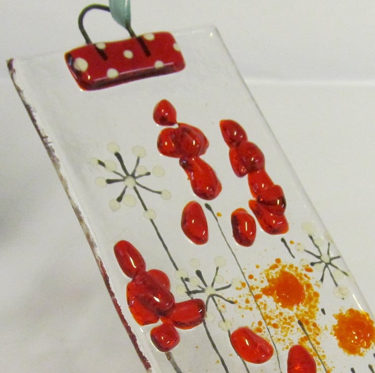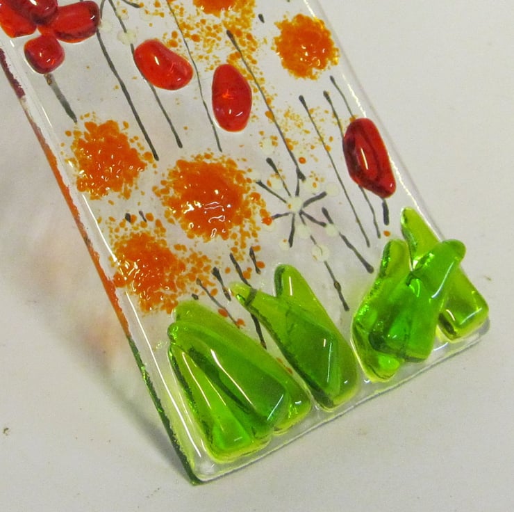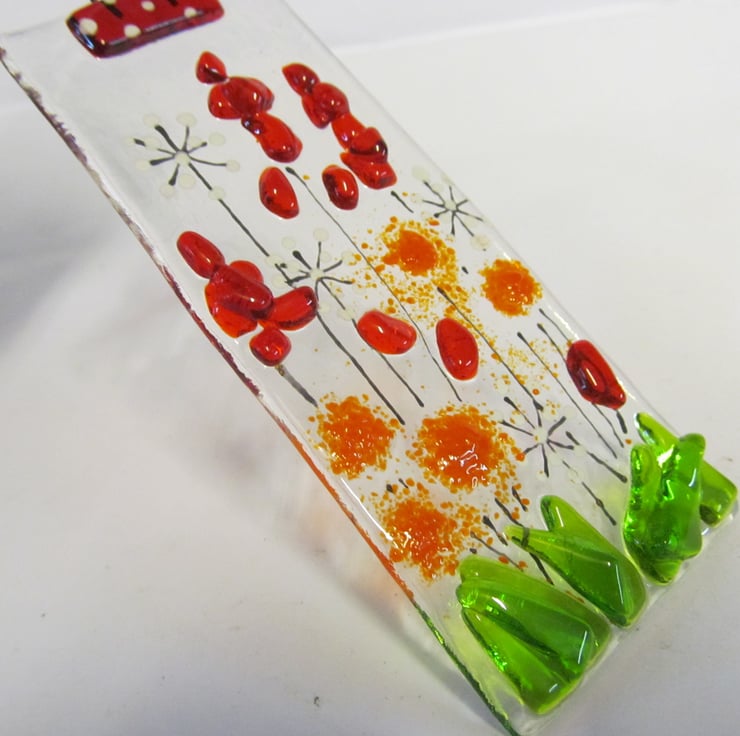This pretty fused glass suncatcher is new to Mango & Mog and depicts a meadow of pretty hollyhocks, foliage and dandelions which have been hand painted and fired into the glass.