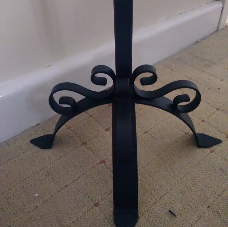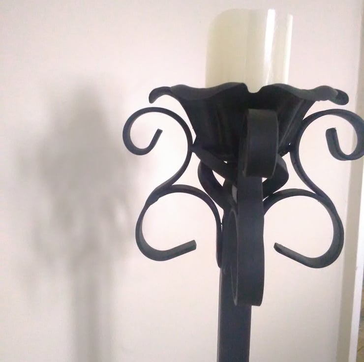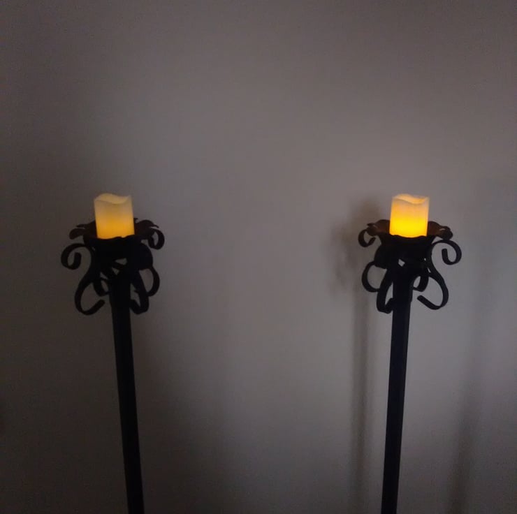 I wanted to create a traditional pair of floor standing candle holders that have an ornate feel to them. After many hours of bending, hammering and welding I came out with these. Exactly what I wanted, they look great in an inglenook fireplace!