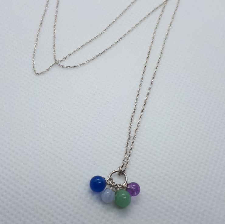 Four small semi precious beads on an 18 inch sterling silver rope chain.