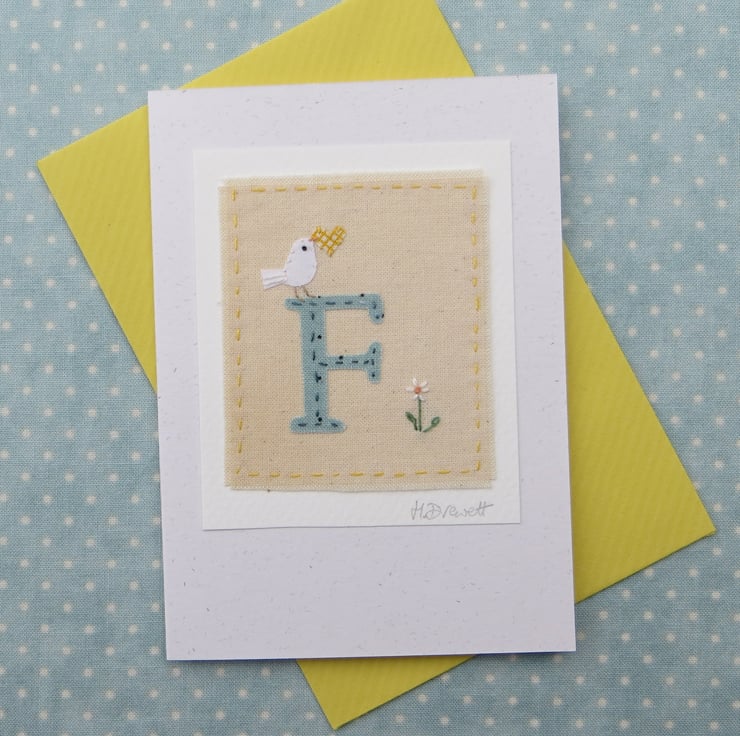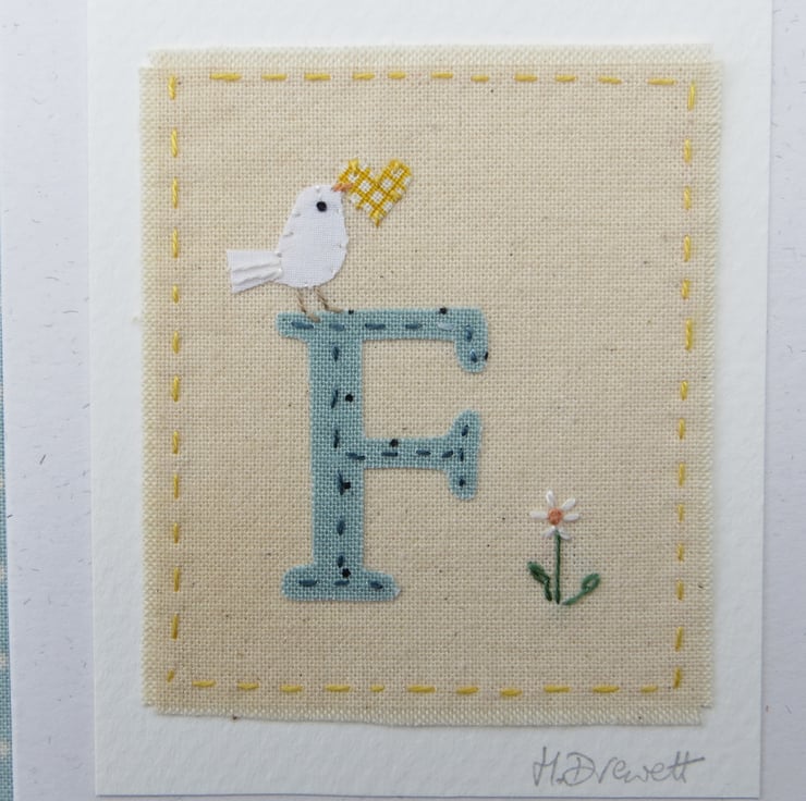 A hand-stitched card with the letter 'F' cut from pretty blue/green fabric stitched into place with tiny stitches. I have added a miniature applique dove with a tiny yellow heart in her beak, and then embroidered a tiny daisy flower to complete the design.