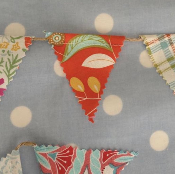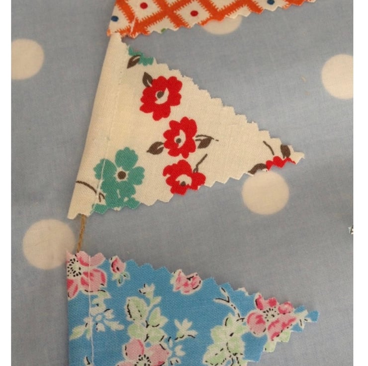 Gorgeous bunting roughly 5 ft long, made using fabrics then attached to Twine , you can slide the little flags along the Twine if you prefer the hearts closer together or further apart