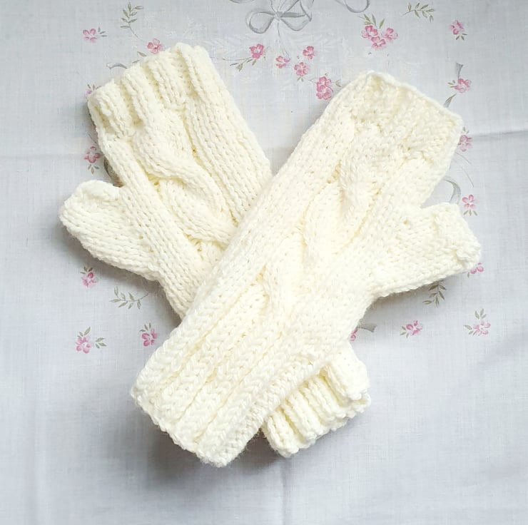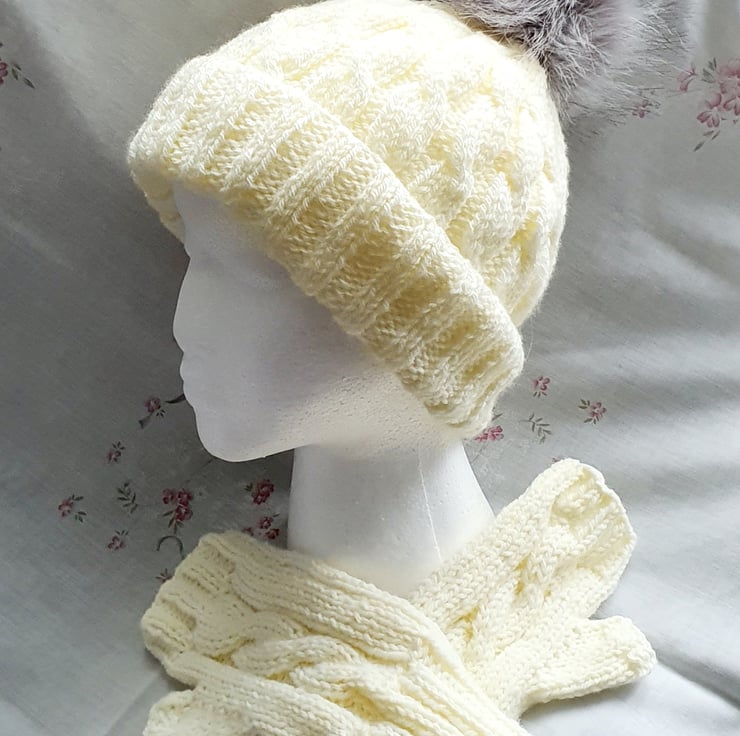 Here we have a hand-knitted Cream Aran cable hat and matching fingerless gloves.