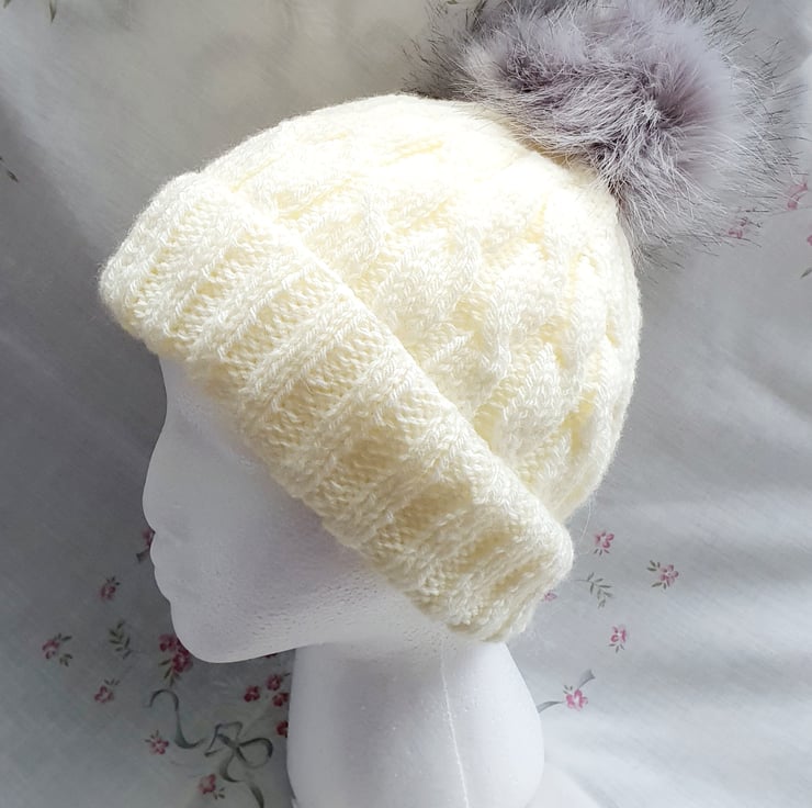 Hat has a detachable faux fur pompom, which is applied by large press stud so it can be removed when washing hat.