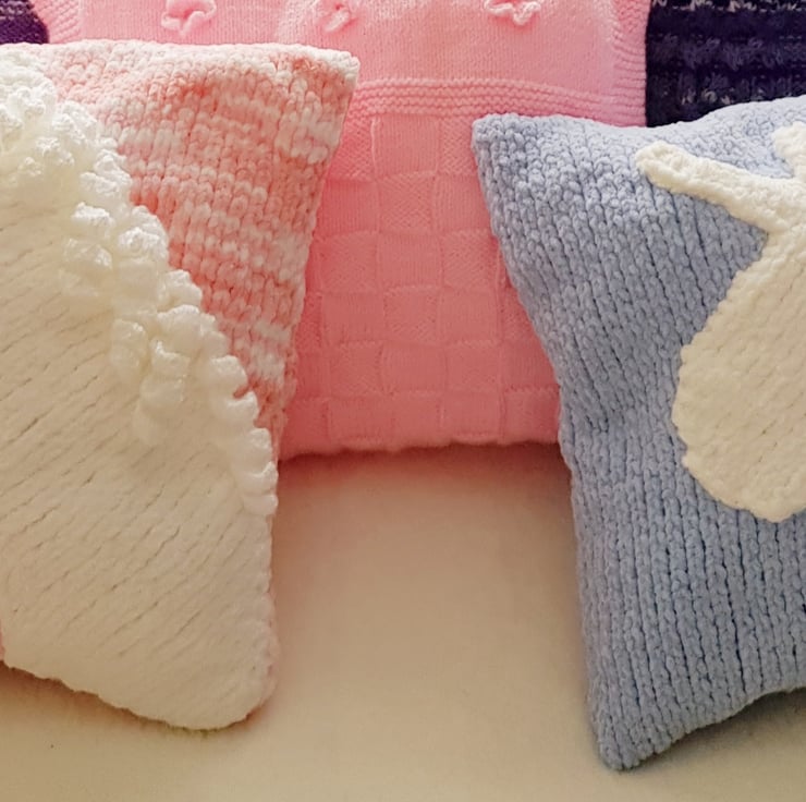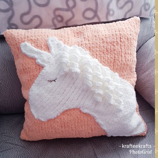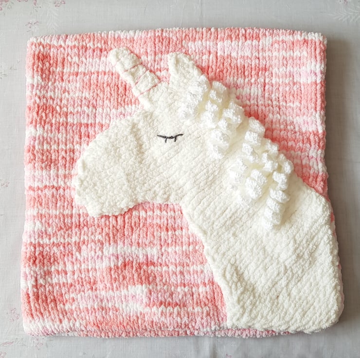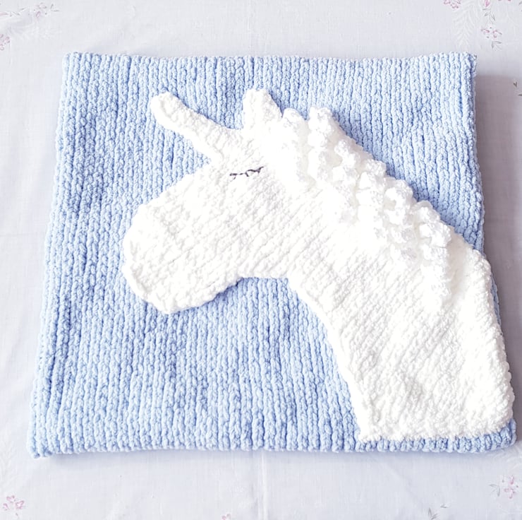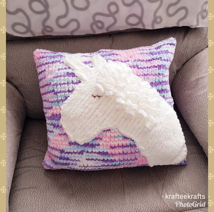 Hand-knitted in a gorgeously soft and chunky yarn. This cushion has a unicorn motif sewn on the front and button closure at the back.