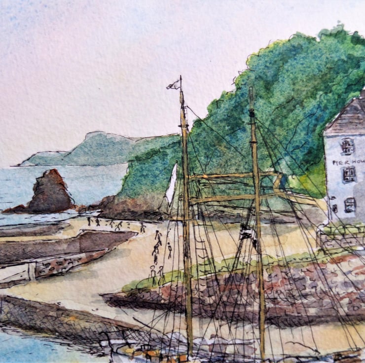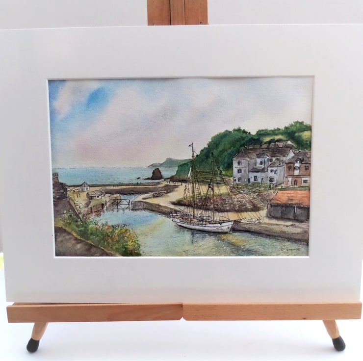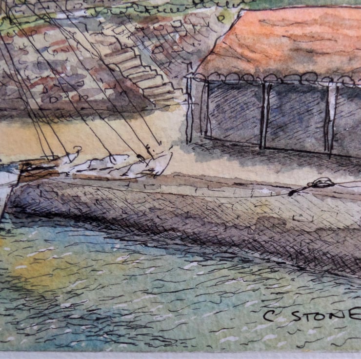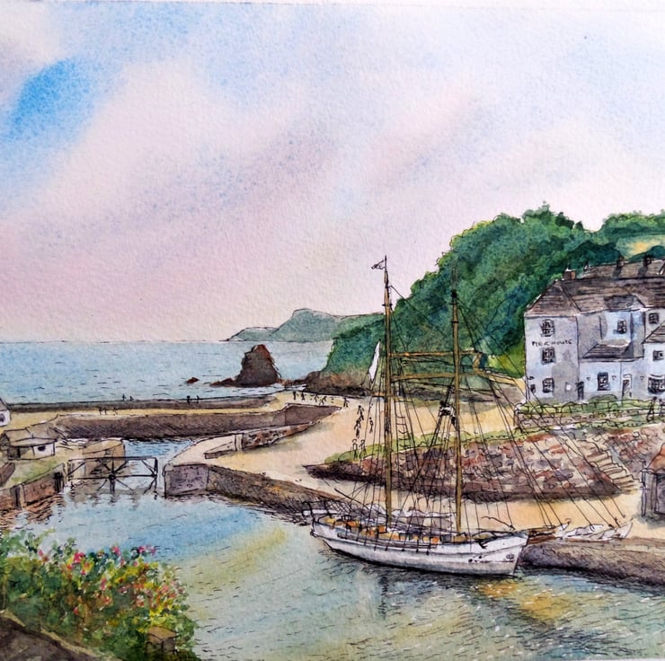 My original watercolour "pen and wash" painting, of the historic harbour at Charlestown, St. Austell, Cornwall, complete with tall ship in dock.