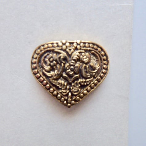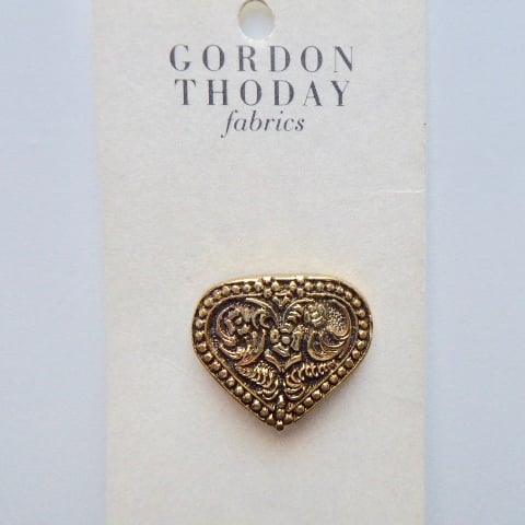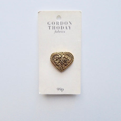 The button is metal with a gilt finish. The heart has a central design of leaves and a rose scroll surrounded with a dotted border.