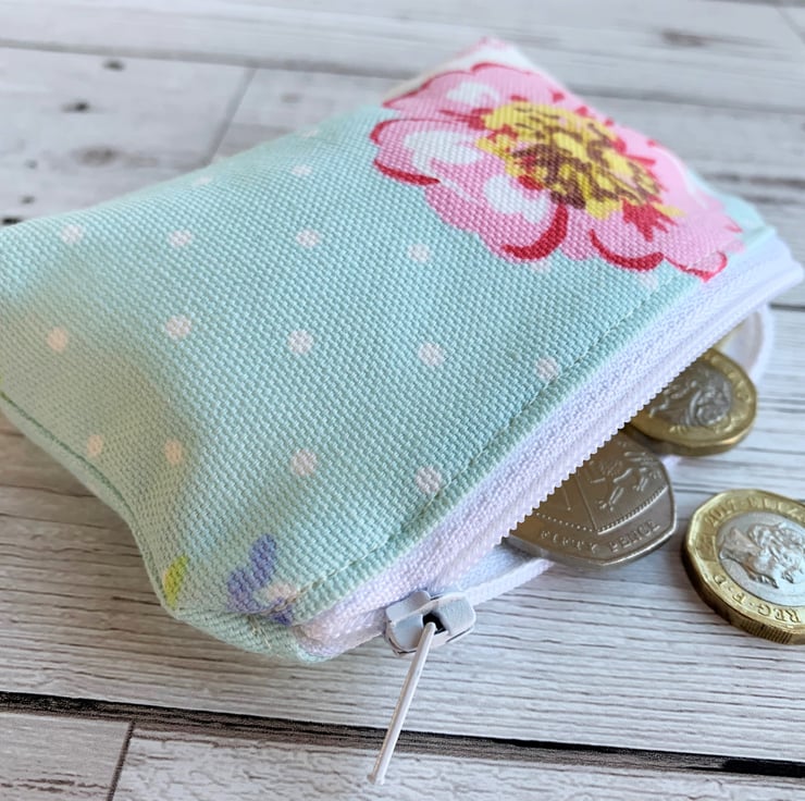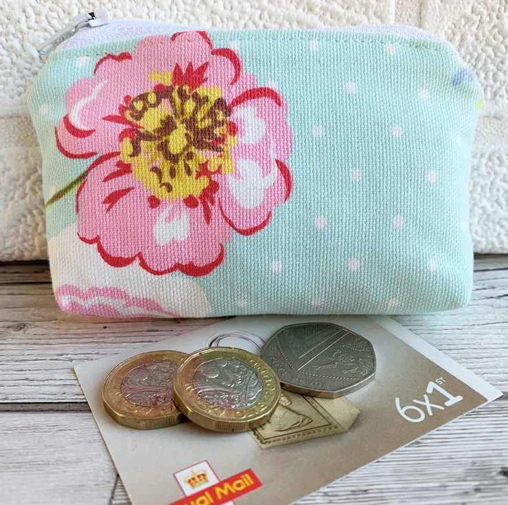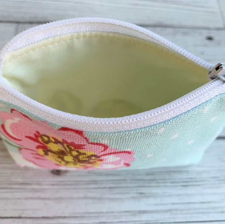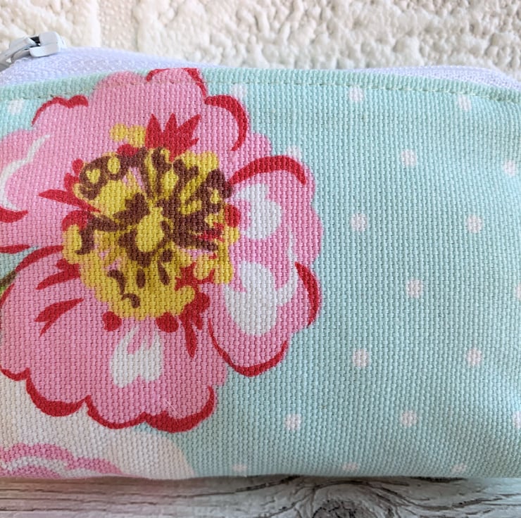 Small coin purse with shabby chic floral and polka dots pattern. A handy small coin purse in lovely shabby chic floral print fabric. The fabric is a pale blue colour with white polka dots and features a flower with a golden yellow centre and pale pink petals edged with red. The coin purse has a white zip and is lined with cream fabric. The base of the purse is boxed to give more space inside.