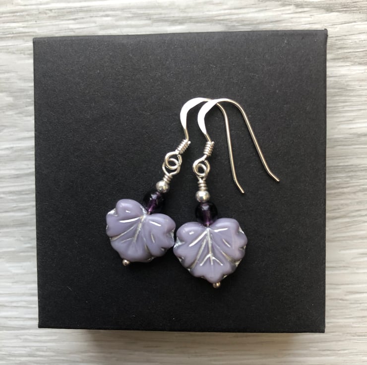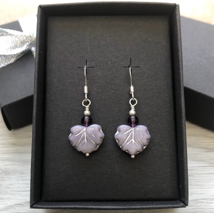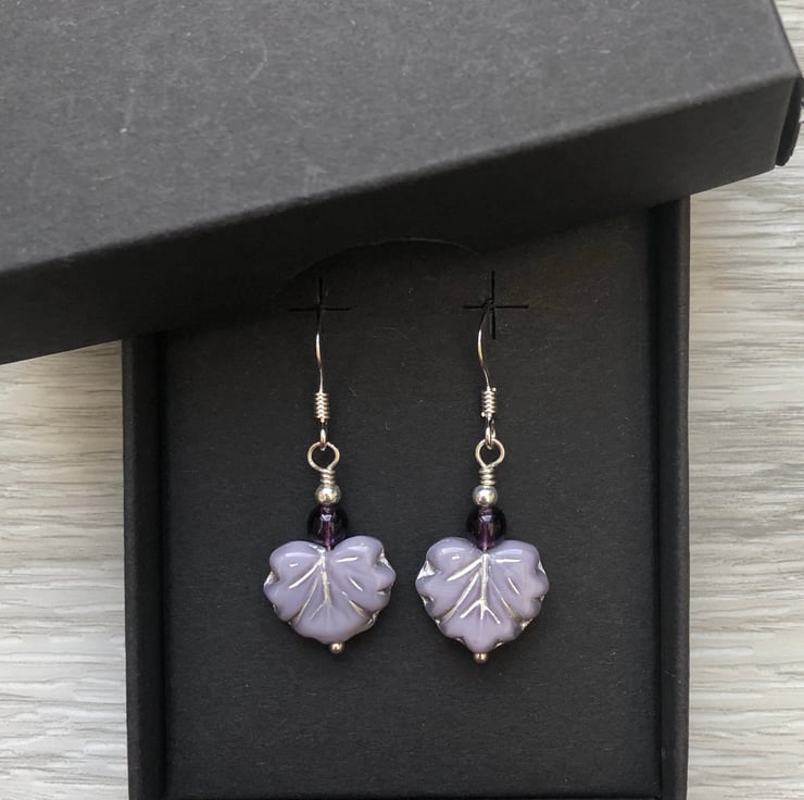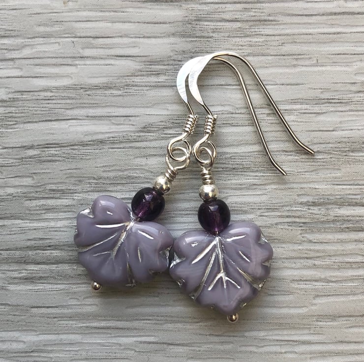 These unique lilac leaf earrings are made using quality Czech glass beads and sterling silver beads. They have been hand wired using a sterling silver headpin and attached to sterling silver fish hook wires.
