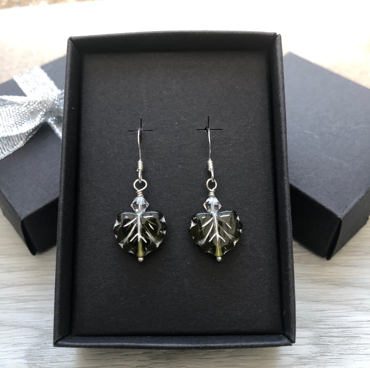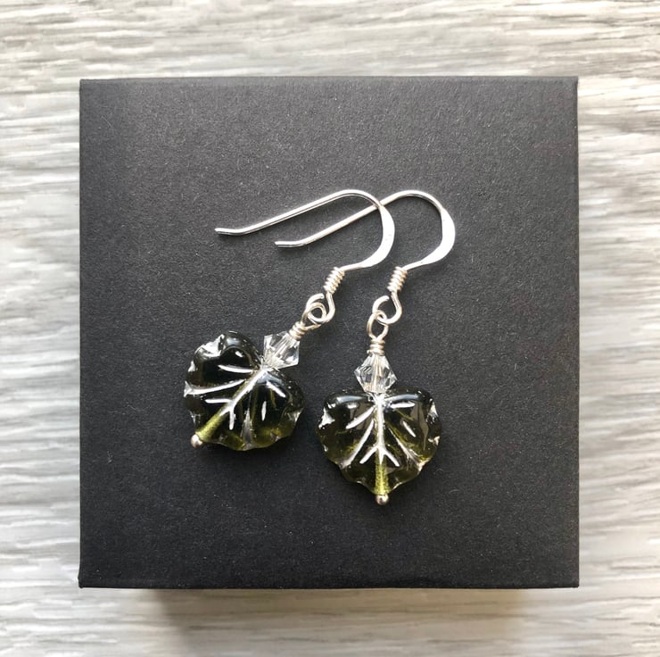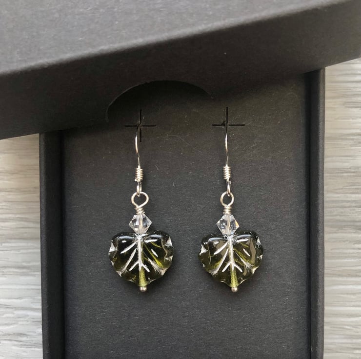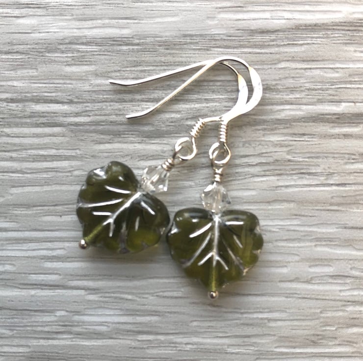 These unique olive green leaf earrings are made using quality Czech glass beads and a Swarovski crystal. They have been hand wired using a sterling silver headpin and attached to sterling silver fish hook wires.