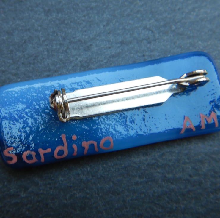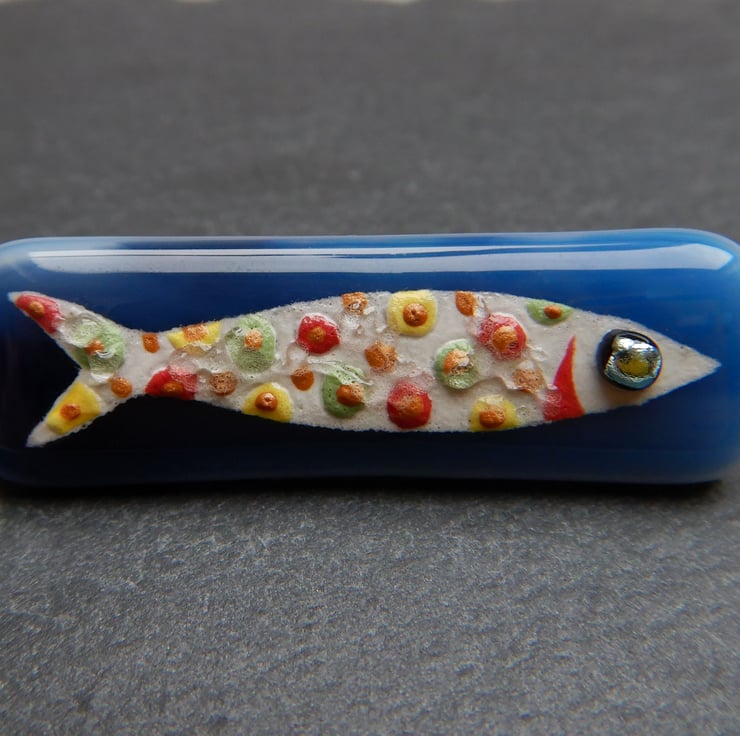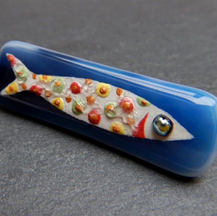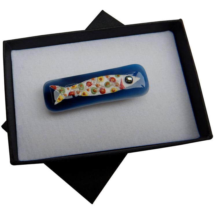 UNIQUE: Handmade Fused Glass 'SARDINE' Brooch. The little fish has been very carefully hand painted onto the surface of a wispy blue glass backing. No paint has been used but instead it is very finely ground fusing glass mixed with water. At this stage the blending of colours and adding of details was possible. The eye of the fish is made from metallic dichroic glass. Finally transparent glass was sprinkled onto the surface, to give the brooch an aquatic finish. The brooch was then fired in my kiln and the powdered glass and background fuse to become one piece.