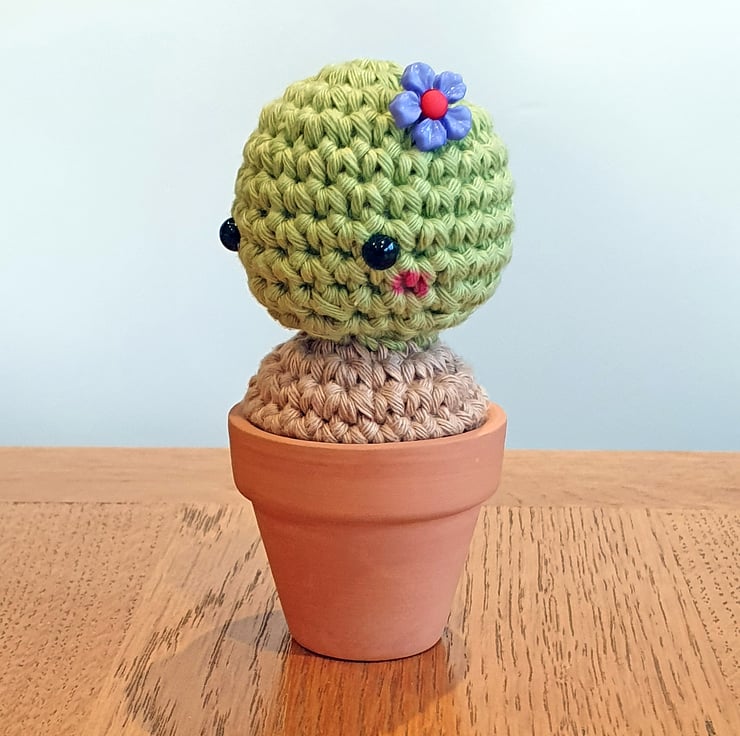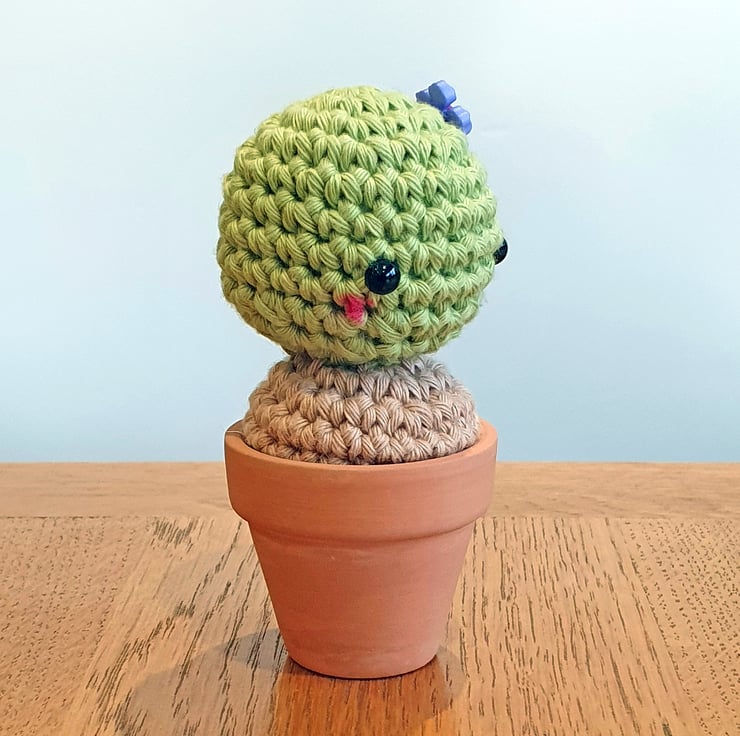 Beryl is handmade in cotton yarn, sat in a little terracotta pot. She is the perfect houseplant - no feeding, no watering, and most importantly no prickles! Her favourite things include raspberry ice cream and watching the Bake Off! Beryl would love a little desk or windowsill to sit on and keep you company.