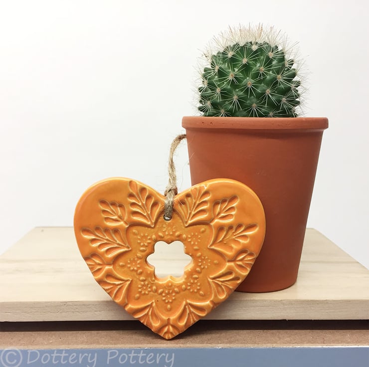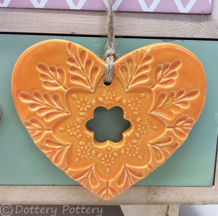 This listing is for a ceramic heart decoration. It is made from white earthenware clay, imprinted with pattern and finished with a bright, glossy glaze. It has been fired twice, once to the bisque stage and then a second firing for the glaze. It measures 7.5 centimetres wide and the same in height x 5mm thick. It can be hung outside.