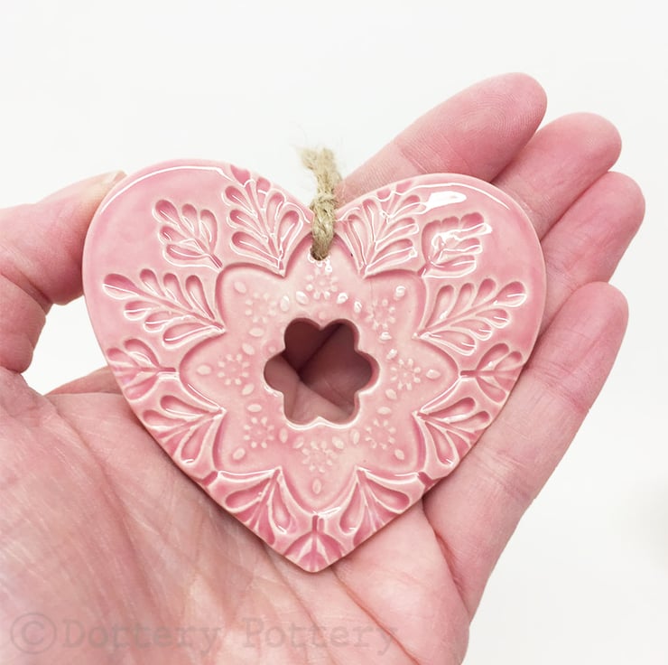 Ceramic heart hanging decoration Pottery Heart Folk art love heart PINK