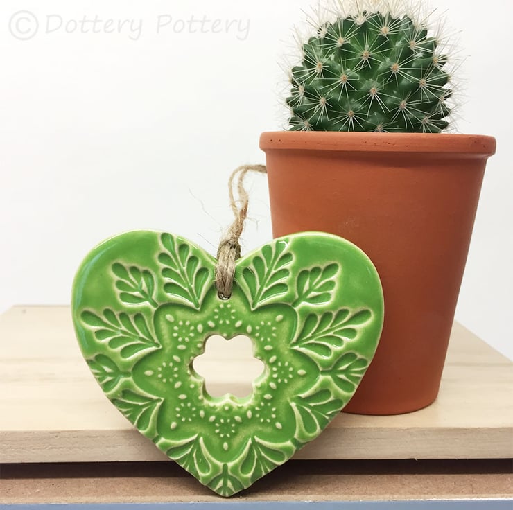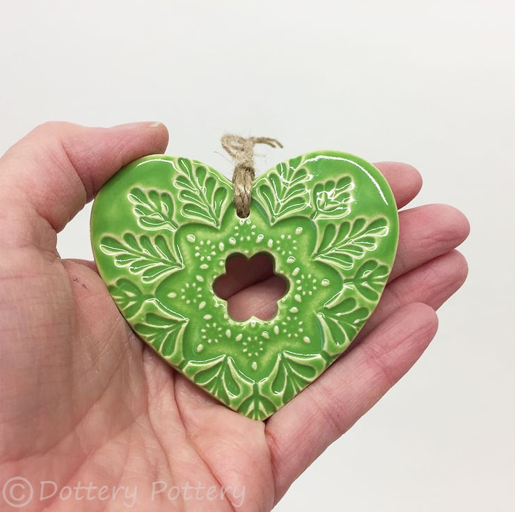Ceramic heart hanging decoration Pottery Heart Folk art love heart GREEN