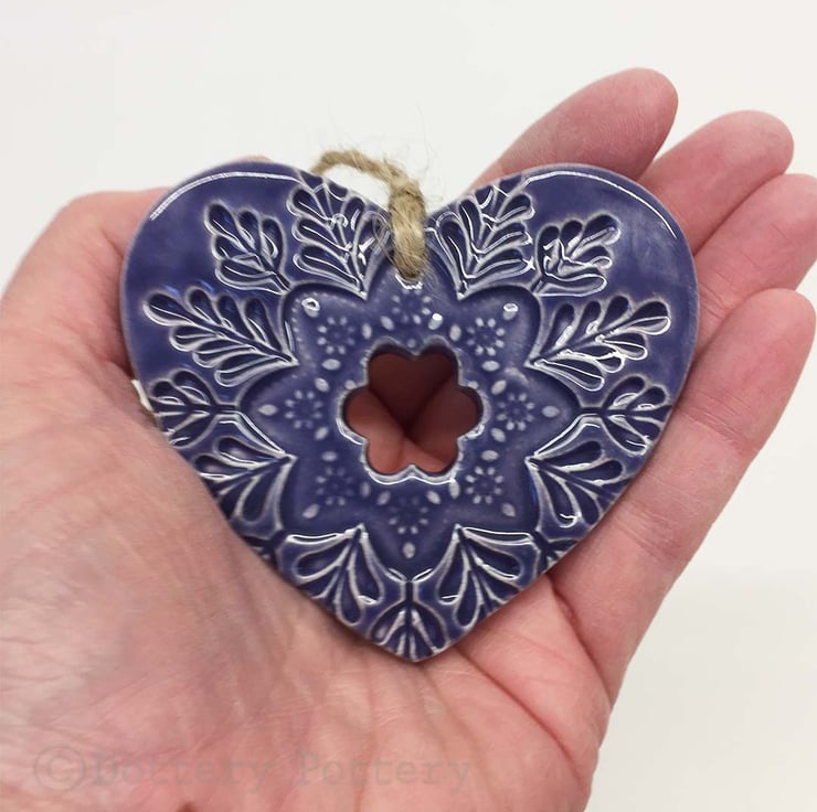This listing is for a ceramic heart decoration. It is made from white earthenware clay, imprinted with pattern and finished with a bright, glossy glaze. It has been fired twice, once to the bisque stage and then a second firing for the glaze. It measures 7.5 centimetres wide and the same in height x 5mm thick. It can be hung outside.