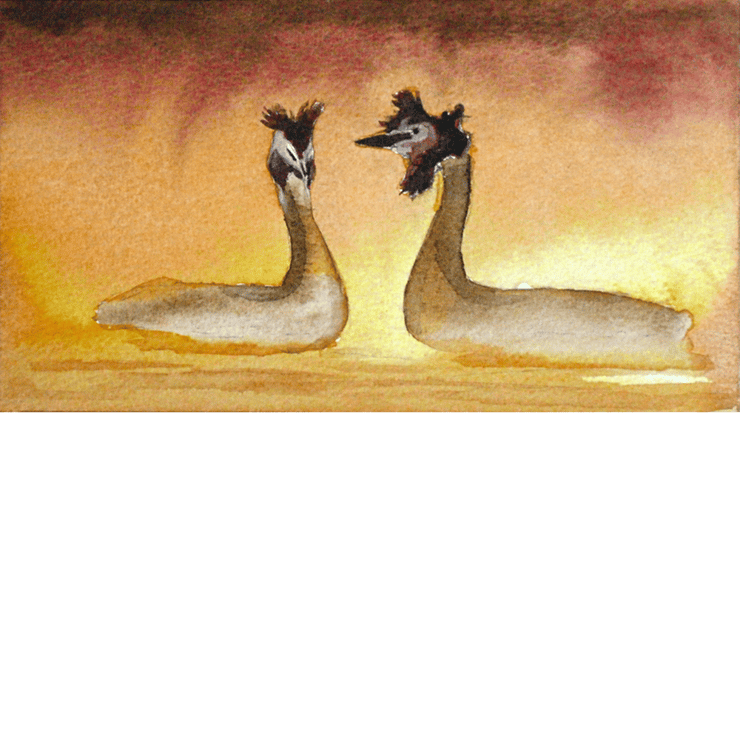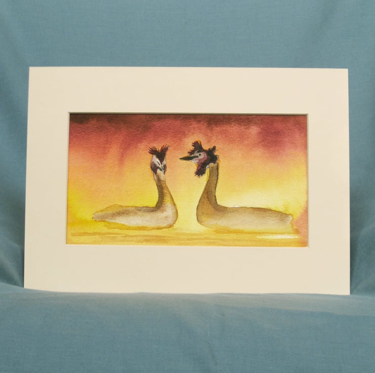 Original painting of a pair of great crested grebe performing their mating ritual in a sunshine haze. 18.8 x 10.3cm. Supplied window mounted, overall matte size 25.4 x 17.8 cm (7 x 10 in). Could be trimmed to 7 x 9 in. or 6 x 9 in. All would fit a standard sized frame.