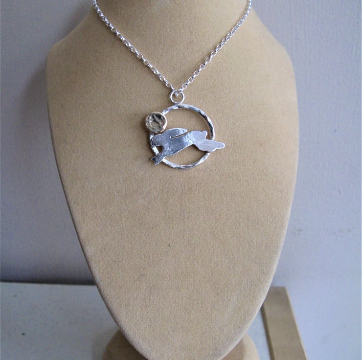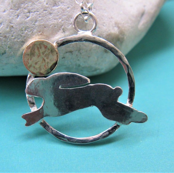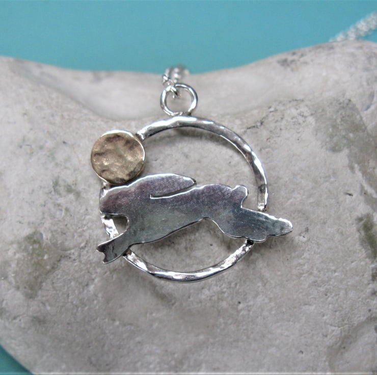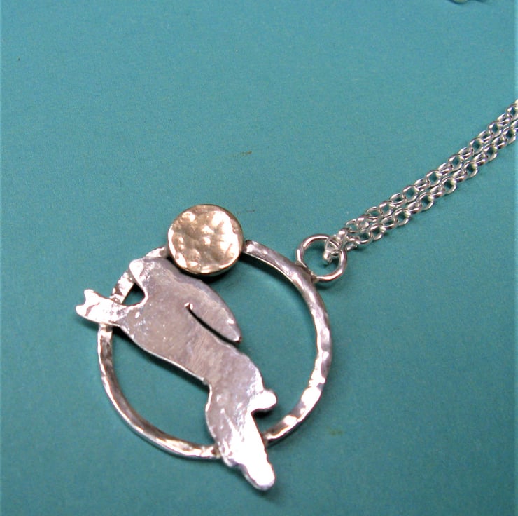 This stunning necklace is made from sterling silver with a 9ct gold textured sun. The hare was hand drawn and cut from sterling silver sheet and the pendant hangs from a 16" sterling silver chain with good quality trigger clasp. (The chain length can be altered upon request.)