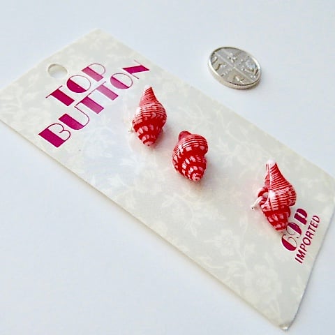 The buttons are peachy pink plastic with white spirals. The shell is a conch design. They have shank backs.