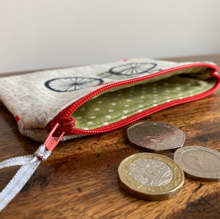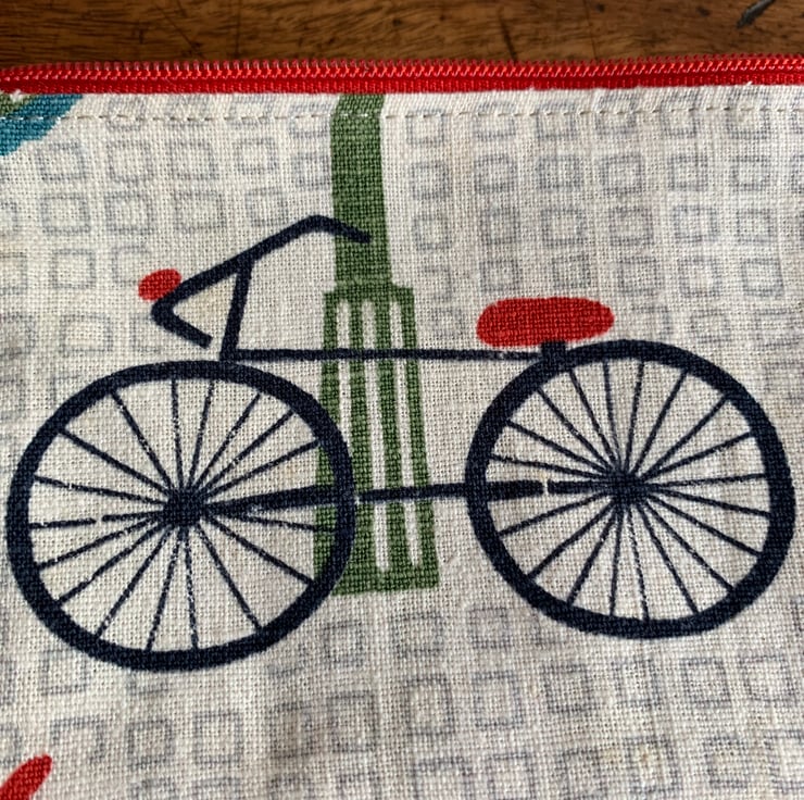 Cute bicycle zip pouch in vintage fabric. I have backed it with thick neutral linen and lined it with spotty cotton. It’s made with a reclaimed zip.