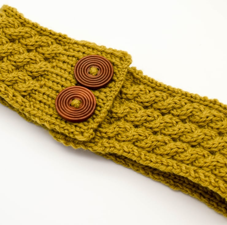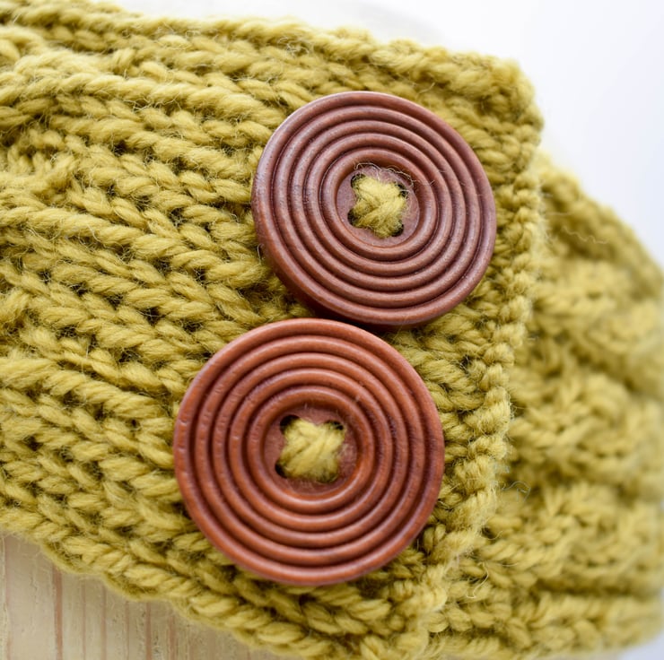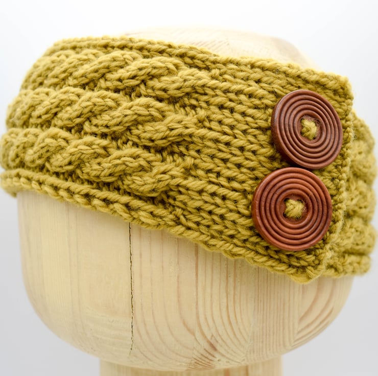 Knitted in beautifully soft 100% merino aran weight yarn. This cosy headband is knitted my own triple braid headband pattern which has three twisted cables along the length of it and two wooden buttons to fasten.