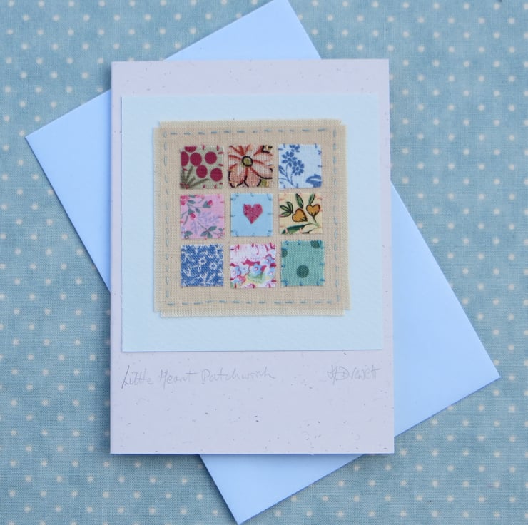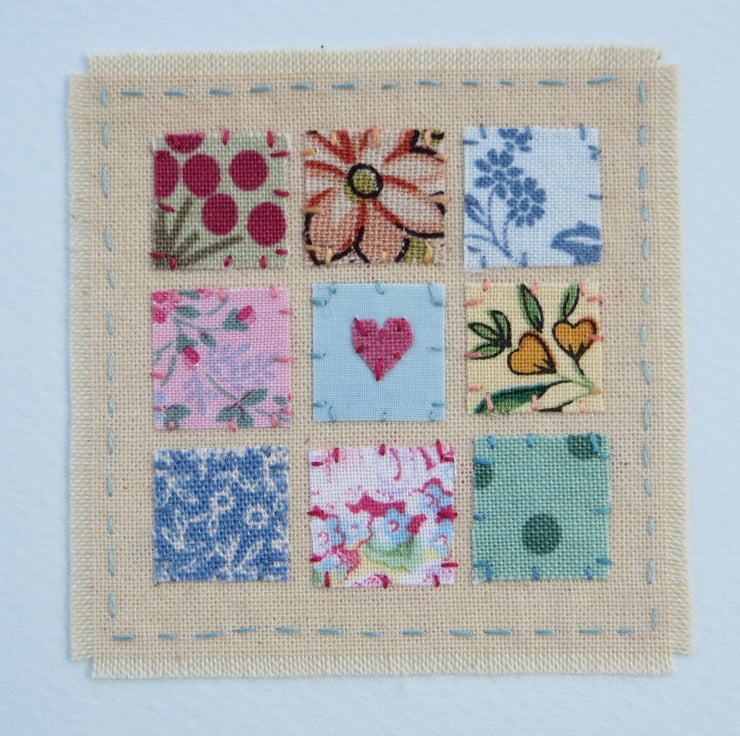 Pretty hand-stitched miniature 'patchwork' applique mounted onto greeting card. The pretty cotton fabrics are chosen with care and the centre square has a tiny heart stitched onto it. Very fine and delicate, perfect for many different occasions. My hand stitched cards are gifts in themselves to keep, as well as a card in which to write your message.
